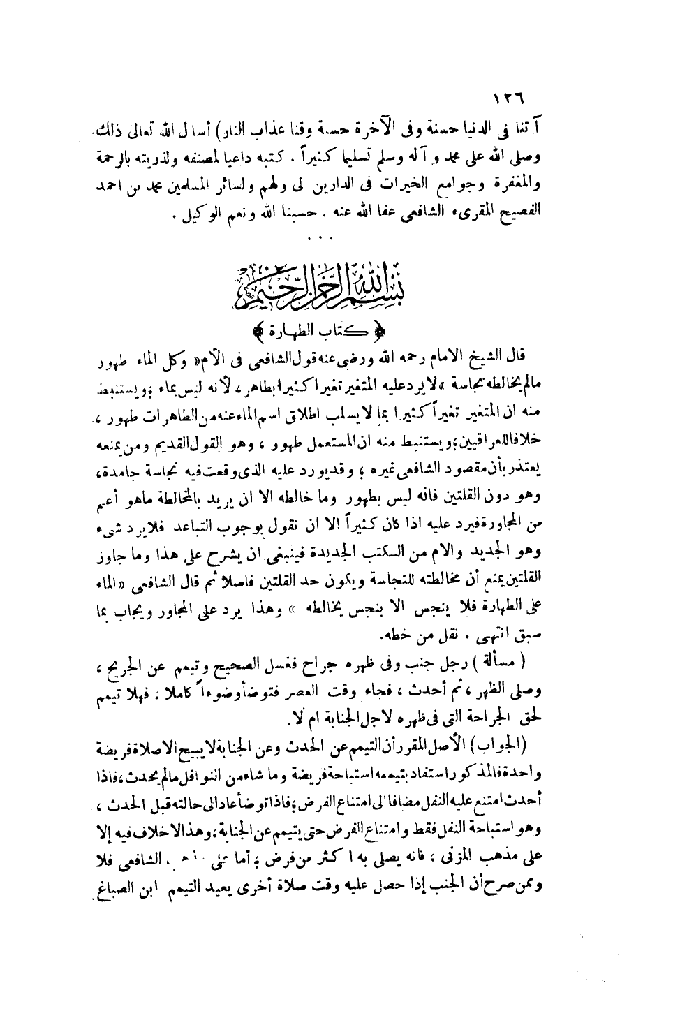 بِسْمِ اللَّهِ الرَّحْمَنِ الرَّحِيمِ كِتَابُ الطَّهَارَةِ قَالَ الشَّيْخُ الْإِمَامُ - رَحِمَهُ اللَّهُ - وَرَضِيَ عَنْهُ قَوْلُ الشَّافِعِيِّ فِي الْأُمِّ " وَكُلُّ الْمَاءِ طَهُورٌ مَا لَمْ يُخَالِطْهُ نَجَاسَةٌ " لَا يَرِدُ عَلَيْهِ الْمُتَغَيِّرُ تَغَيُّرًا كَثِيرًا بِطَاهِرٍ لِأَنَّهُ لَيْسَ بِمَاءٍ، وَيَسْتَنْبِطُ مِنْهُ أَنَّ الْمُتَغَيِّرَ تَغَيُّرًا كَثِيرًا بِمَا لَا يَسْلُبُ إطْلَاقَ اسْمِ الْمَاءِ عَنْهُ مِنْ الطَّاهِرَاتِ طَهُورٌ، خِلَافًا لِلْعِرَاقِيِّينَ؛ وَيَسْتَنْبِطُ مِنْهُ أَنَّ الْمُسْتَعْمَلَ طَهُورٌ، وَهُوَ الْقَوْلُ الْقَدِيمُ وَمَنْ يَمْنَعُهُ يَعْتَذِرُ بِأَنَّ مَقْصُودَ الشَّافِعِيِّ غَيْرُهُ؛ وَقَدْ يُورِدُ عَلَيْهِ الَّذِي وَقَعَتْ فِيهِ نَجَاسَةٌ جَامِدَةٌ، وَهُوَ دُونَ الْقُلَّتَيْنِ فَإِنَّهُ لَيْسَ بِطَهُورٍ وَمَا خَالَطَهُ إلَّا أَنْ يُرِيدَ بِالْمُخَالَطَةِ مَا هُوَ أَعَمُّ مِنْ الْمُجَاوَرَةِ فَيَرِدُ عَلَيْهِ إذَا كَانَ كَثِيرًا إلَّا أَنْ نَقُولَ بِوُجُوبِ التَّبَاعُدِ فَلَا يَرِدُ شَيْءٌ وَهُوَ الْجَدِيدُ وَالْأُمُّ مِنْ الْكُتُبِ الْجَدِيدَةِ فَيَنْبَغِي أَنْ يُشْرَحَ عَلَى هَذَا وَمَا جَاوَزَ الْقُلَّتَيْنِ يَمْنَعُ أَنَّ مُخَالَطَتَهُ لِلنَّجَاسَةِ وَيَكُونُ حَدُّ الْقُلَّتَيْنِ فَاصِلًا ثُمَّ قَالَ الشَّافِعِيُّ " الْمَاءُ عَلَى الطَّهَارَةِ فَلَا يُنَجَّسُ إلَّا بِنَجَسٍ يُخَالِطُهُ " وَهَذَا يَرُدُّ عَلَى الْمُجَاوِرِ وَيُجَابُ بِمَا سَبَقَ انْتَهَى. نَقْلٌ مِنْ خَطِّهِ.