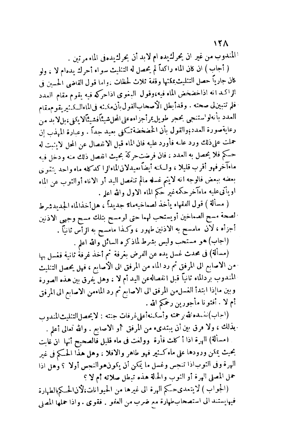 (أَجَابَ) إنْ كَانَ الْمَاءُ رَاكِدًا لَمْ يَحْصُلْ لَهُ التَّثْلِيثُ سَوَاءٌ أَحَرَّكَ يَدَهُ أَمْ لَا، وَلَوْ كَانَ جَارِيًا حَصَلَ التَّثْلِيثُ بِمُكْثِهَا وَقْفَةَ ثَلَاثِ لَحَظَاتٍ، وَأَمَّا قَوْلُ الْقَاضِي الْحُسَيْنِ فِي الرَّاكِدِ: إنَّهُ إذَا خَضْخَضَ الْمَاءَ فِيهِ، وَقَوْلُ الْبَغَوِيِّ إذَا حَرَّكَهُ فِيهِ يَقُومُ مَقَامَ الْعَدَدِ فَلَمْ تَتَبَيَّنْ لِي صِحَّتُهُ. وَقَدْ أَبْطَلَ الْأَصْحَابُ الْقَوْلَ بِأَنَّ مُكْثَهُ فِي الْمَاءِ الْكَثِيرِ يَقُومُ مَقَامَ الْعَدَدِ بِأَنَّهُ لَوْ اسْتَنْجَى بِحَجَرٍ طَوِيلٍ يُمِرُّ أَجْزَاءَهُ عَلَى الْمَحَلِّ شَيْئًا فَشَيْئًا لَا يَكْفِي، بَلْ لَا بُدَّ مِنْ رِعَايَةِ صُورَةِ الْعَدَدِ؛ وَالْقَوْلُ بِأَنَّ الْخَضْخَضَةَ تَكْفِي بَعِيدٌ جِدًّا.