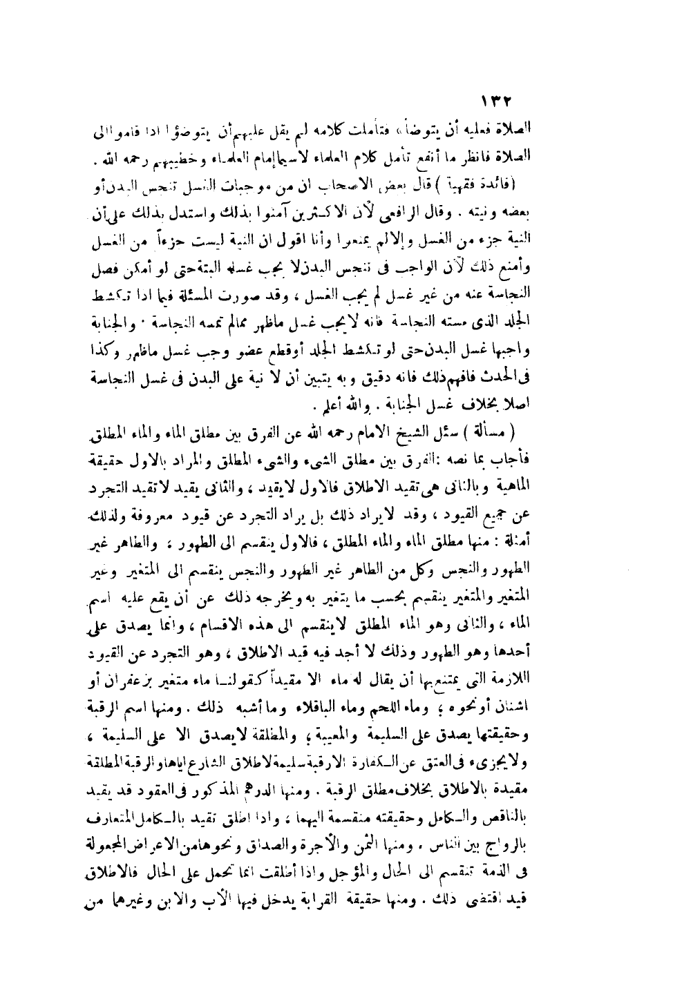 (مَسْأَلَةٌ) سُئِلَ الشَّيْخُ الْإِمَامُ - رَحِمَهُ اللَّهُ - عَنْ الْفَرْقِ بَيْنَ مُطْلَقِ الْمَاءِ وَالْمَاءِ الْمُطْلَقِ فَأَجَابَ بِمَا نَصُّهُ: الْفَرْقُ بَيْنَ مُطْلَقِ الشَّيْءِ وَالشَّيْءِ الْمُطْلَقِ وَالْمُرَادُ بِالْأَوَّلِ حَقِيقَةُ الْمَاهِيَّةِ وَبِالثَّانِي هِيَ تَقَيُّدُ الْإِطْلَاقِ فَالْأَوَّلُ لَا يُقَيِّدُ، وَالثَّانِي يُقَيِّدُ لَا تَقَيُّدَ التَّجَرُّدِ عَنْ جَمِيعِ الْقُيُودِ، وَقَدْ لَا يُرَادُ ذَلِكَ بَلْ يُرَادُ التَّجَرُّدُ عَنْ قُيُودٍ مَعْرُوفَةٍ وَلِذَلِكَ أَمْثِلَةٌ: مِنْهَا مُطْلَقُ الْمَاءِ وَالْمَاءُ الْمُطْلَقُ، فَالْأَوَّلُ يَنْقَسِمُ إلَى الطَّهُورِ، وَالطَّاهِرِ غَيْرِ الطَّهُورِ وَالنَّجِسِ وَكُلٌّ مِنْ الطَّاهِرِ غَيْرِ الطَّهُورِ وَالنَّجِسِ يَنْقَسِمُ إلَى الْمُتَغَيِّرِ وَغَيْرِ الْمُتَغَيِّرِ وَالْمُتَغَيِّرُ يَنْقَسِمُ بِحَسَبِ مَا يَتَغَيَّرُ بِهِ وَيُخْرِجُهُ ذَلِكَ عَنْ أَنْ يَقَعَ عَلَيْهِ اسْمُ الْمَاءِ.