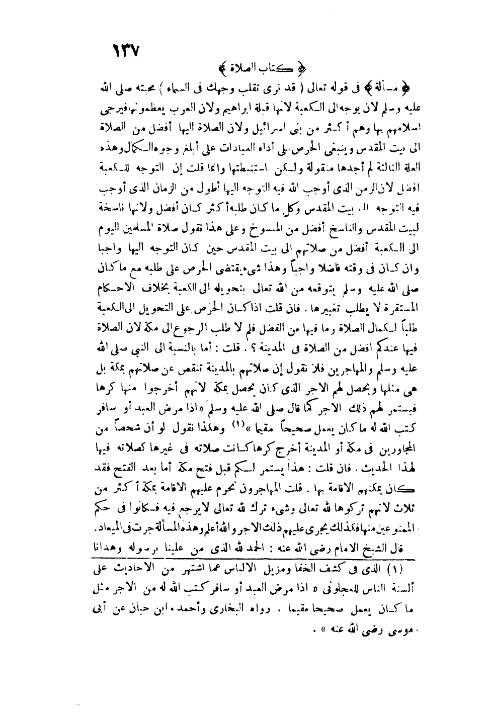 ِ (مَسْأَلَةٌ) فِي قَوْله تَعَالَى {قَدْ نَرَى تَقَلُّبَ وَجْهِكَ فِي السَّمَاءِ} [البقرة: 144] مَحَبَّتُهُ - صَلَّى اللَّهُ عَلَيْهِ وَسَلَّمَ - لَأَنْ يُوَجَّهَ إلَى الْكَعْبَةِ لِأَنَّهَا قِبْلَةُ إبْرَاهِيمَ وَلِأَنَّ الْعَرَبَ يُعَظِّمُونَهَا فَيُرْجَى إسْلَامُهُمْ بِهَا وَهُمْ أَكْثَرُ مِنْ بَنِي إسْرَائِيلَ وَلِأَنَّ الصَّلَاةَ إلَيْهَا أَفْضَلُ مِنْ الصَّلَاةِ إلَى بَيْتِ الْمَقْدِسِ وَيَنْبَغِي الْحِرْصُ عَلَى أَدَاءِ الْعِبَادَاتِ عَلَى أَبْلَغِ وُجُوهِ الْكَمَالِ وَهَذِهِ الْعِلَّةُ الثَّالِثَةُ لَمْ أَجِدْهَا مَنْقُولَةً وَلَكِنْ اسْتَنْبَطْتُهَا وَإِنَّمَا قُلْت إنَّ التَّوَجُّهَ لِلْكَعْبَةِ أَفْضَلُ لِأَنَّ الزَّمَنَ الَّذِي أَوْجَبَ اللَّهُ فِيهِ التَّوَجُّهَ إلَيْهَا أَطْوَلُ مِنْ الزَّمَانِ الَّذِي أَوْجَبَ فِيهِ التَّوَجُّهَ إلَى بَيْتِ الْمَقْدِسِ وَكُلُّ مَا كَانَ طَلَبُهُ أَكْثَرَ كَانَ أَفْضَلَ وَلِأَنَّهَا نَاسِخَةٌ لِبَيْتِ الْمَقْدِسِ وَالنَّاسِخُ أَفْضَلُ مِنْ الْمَنْسُوخِ وَعَلَى هَذَا نَقُولُ: صَلَاةُ الْمُسْلِمِينَ الْيَوْمَ إلَى الْكَعْبَةِ أَفْضَلُ مِنْ صَلَاتِهِمْ إلَى بَيْتِ الْمَقْدِسِ حِينَ كَانَ التَّوَجُّهُ إلَيْهَا وَاجِبًا وَإِنْ كَانَ فِي وَقْتِهِ فَاضِلًا وَاجِبًا وَهَذَا شَيْءٌ يَقْتَضِي الْحِرْصَ عَلَى طَلَبِهِ مَعَ مَا كَانَ - صَلَّى اللَّهُ عَلَيْهِ وَسَلَّمَ - يَتَوَقَّعُهُ مِنْ اللَّهِ تَعَالَى بِتَحْوِيلِهِ إلَى الْكَعْبَةِ بِخِلَافِ الْأَحْكَامِ الْمُسْتَقِرَّةِ لَا يَطْلُبُ تَغْيِيرَهَا. فَإِنْ قُلْت: إذَا كَانَ الْحِرْصُ عَلَى التَّحْوِيلِ إلَى الْكَعْبَةِ طَلَبًا لِكَمَالِ الصَّلَاةِ وَمَا فِيهَا مِنْ الْفَضْلِ فَلِمَ لَا طَلَبَ الرُّجُوعَ إلَى مَكَّةَ لِأَنَّ الصَّلَاةَ فِيهَا عِنْدَكُمْ أَفْضَلُ مِنْ الصَّلَاةِ فِي الْمَدِينَةِ؟ قُلْت: أَمَّا بِالنِّسْبَةِ إلَى النَّبِيِّ - صَلَّى اللَّهُ عَلَيْهِ وَسَلَّمَ - وَالْمُهَاجِرِينَ فَلَا نَقُولُ: إنَّ صَلَاتَهُمْ بِالْمَدِينَةِ تَنْقُصُ عَنْ صَلَاتِهِمْ بِمَكَّةَ بَلْ هِيَ مِثْلُهَا وَيَحْصُلُ لَهُمْ الْأَجْرُ الَّذِي كَانَ يَحْصُلُ بِمَكَّةَ لِأَنَّهُمْ أُخْرِجُوا مِنْهَا كَرْهًا فَيَسْتَمِرُّ لَهُمْ ذَلِكَ الْأَجْرُ كَمَا قَالَ - صَلَّى اللَّهُ عَلَيْهِ وَسَلَّمَ - «إذَا مَرِضَ الْعَبْدُ أَوْ سَافَرَ كَتَبَ اللَّهُ لَهُ مَا كَانَ يَعْمَلُ صَحِيحًا مُقِيمًا» .