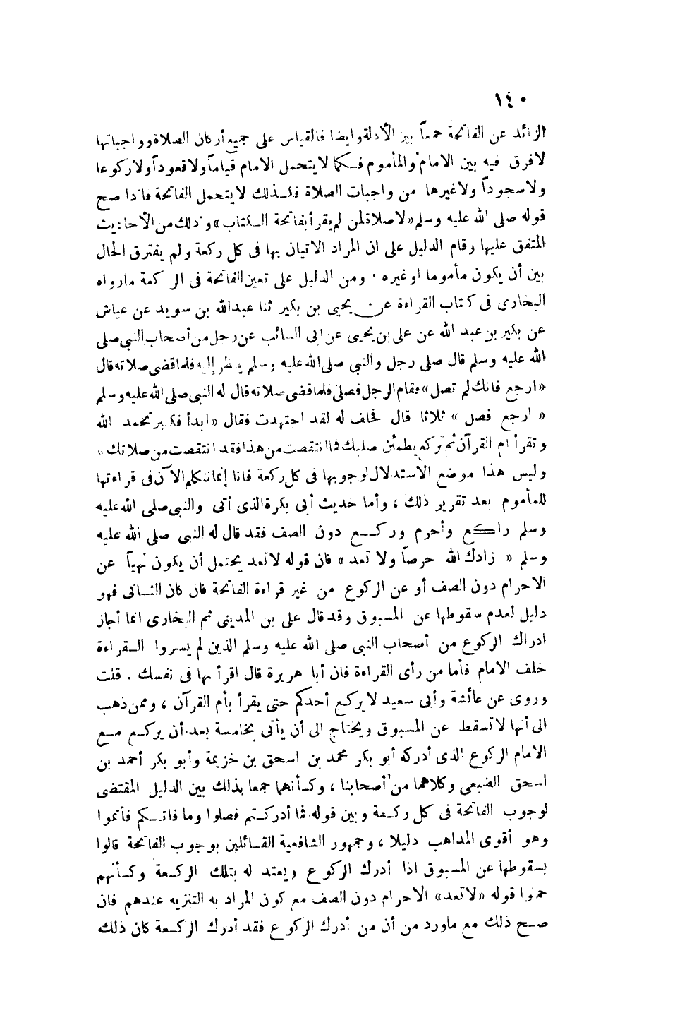 الزَّائِدِ عَنْ الْفَاتِحَةِ جَمْعًا بَيْنَ الْأَدِلَّةِ وَأَيْضًا فَالْقِيَاسُ عَلَى جَمِيعِ أَرْكَانِ الصَّلَاةِ وَوَاجِبَاتِهَا لَا فَرْقَ فِيهِ بَيْنَ الْإِمَامِ وَالْمَأْمُومِ فَكَمَا لَا يَتَحَمَّلُ الْإِمَامُ قِيَامًا وَلَا قُعُودًا وَلَا رُكُوعًا وَلَا سُجُودًا وَلَا غَيْرَهَا مِنْ وَاجِبَاتِ الصَّلَاةِ فَكَذَلِكَ لَا يَتَحَمَّلُ الْفَاتِحَةَ فَإِذَا صَحَّ قَوْلُهُ - صَلَّى اللَّهُ عَلَيْهِ وَسَلَّمَ - «لَا صَلَاةَ لِمَنْ لَمْ يَقْرَأْ بِفَاتِحَةِ الْكِتَابِ» وَذَلِكَ مِنْ الْأَحَادِيثِ الْمُتَّفَقِ عَلَيْهَا وَقَامَ الدَّلِيلُ عَلَى أَنَّ الْمُرَادَ الْإِتْيَانُ بِهَا فِي كُلِّ رَكْعَةٍ وَلَمْ يَفْتَرِقْ الْحَالُ بَيْنَ أَنْ يَكُونَ مَأْمُومًا أَوْ غَيْرَهُ. وَمِنْ الدَّلِيلِ عَلَى تَعَيُّنِ الْفَاتِحَةِ فِي الرَّكْعَةِ مَا رَوَاهُ الْبُخَارِيُّ فِي كِتَابِ الْقِرَاءَةِ عَنْ يَحْيَى بْنِ بُكَيْرٍ ثنا عَبْدُ اللَّهِ بْنُ سُوَيْد عَنْ عَيَّاشٍ عَنْ بُكَيْرِ بْنِ عَبْدِ اللَّهِ عَنْ عَلِيِّ بْنِ يَحْيَى عَنْ أَبِي السَّائِبِ عَنْ رَجُلٍ مِنْ أَصْحَابِ النَّبِيِّ - صَلَّى اللَّهُ عَلَيْهِ وَسَلَّمَ - قَالَ «صَلَّى رَجُلٌ وَالنَّبِيُّ - صَلَّى اللَّهُ عَلَيْهِ وَسَلَّمَ - يَنْظُرُ إلَيْهِ فَلَمَّا قَضَى صَلَاتَهُ قَالَ ارْجِعْ فَإِنَّك لَمْ تُصَلِّ فَقَامَ الرَّجُلُ فَصَلَّى فَلَمَّا قَضَى صَلَاتَهُ قَالَ لَهُ النَّبِيُّ - صَلَّى اللَّهُ عَلَيْهِ وَسَلَّمَ - ارْجِعْ فَصَلِّ ثَلَاثًا قَالَ فَحَلَفَ لَهُ لَقَدْ اجْتَهَدْت فَقَالَ ابْدَأْ فَكَبِّرْ تَحْمَدُ اللَّهَ وَتَقْرَأُ أُمَّ الْقُرْآنِ ثُمَّ تَرْكَعُ يَطْمَئِنُّ صُلْبُك فَمَا انْتَقَصْت مِنْ هَذَا فَقَدْ انْتَقَصْت مِنْ صَلَاتِك» وَلَيْسَ هَذَا مَوْضِعُ الِاسْتِدْلَالِ لِوُجُوبِهَا فِي كُلِّ رَكْعَةٍ فَإِنَّا إنَّمَا نَتَكَلَّمُ الْآنَ فِي قِرَاءَتِهَا لِلْمَأْمُومِ بَعْدَ تَقْرِيرِ ذَلِكَ.