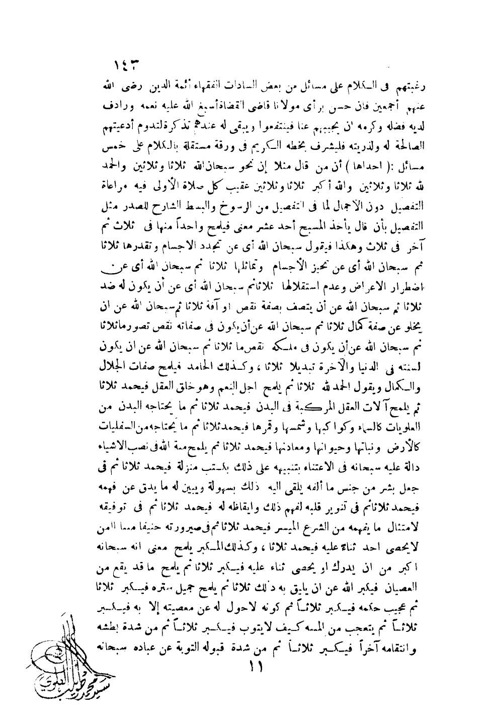 (إحْدَاهَا) أَنَّ مَنْ قَالَ مَثَلًا: إنَّ نَحْوَ سُبْحَانَ اللَّهِ ثَلَاثًا وَثَلَاثِينَ وَالْحَمْدُ لِلَّهِ ثَلَاثًا وَثَلَاثِينَ وَاَللَّهُ أَكْبَرُ ثَلَاثًا وَثَلَاثِينَ عَقِيبَ كُلِّ صَلَاةٍ الْأَوْلَى فِيهِ مُرَاعَاةُ التَّفْصِيلِ دُونَ الْإِجْمَالِ لِمَا فِي التَّفْصِيلِ مِنْ الرُّسُوخِ وَالْبَسْطِ الشَّارِحِ لِلصَّدْرِ مِثْلَ التَّفْصِيلِ بِأَنْ قَالَ: يَأْخُذُ الْمُسَبِّحُ أَحَدَ عَشَرَ مَعْنًى فَيُلَمِّحُ وَاحِدًا مِنْهَا فِي ثَلَاثٍ ثُمَّ آخَرَ فِي ثَلَاثٍ وَهَكَذَا فَيَقُولُ: سُبْحَانَ اللَّهِ أَيْ عَنْ تَجَدُّدِ الْأَجْسَامِ وَتَقَدُّرِهَا ثَلَاثًا ثُمَّ سُبْحَانَ اللَّهِ أَيْ عَنْ تَحَيُّزِ الْأَجْسَامِ وَتَمَاثُلِهَا ثَلَاثًا ثُمَّ سُبْحَانَ اللَّهِ أَيْ عَنْ اضْطِرَارِ الْأَعْرَاضِ وَعَدَمِ اسْتِقْلَالِهَا ثَلَاثًا ثُمَّ سُبْحَانَ اللَّهِ أَيْ عَنْ أَنْ يَكُونَ لَهُ ضِدٌّ ثَلَاثًا ثُمَّ سُبْحَانَ اللَّهِ عَنْ أَنْ يَتَّصِفَ بِصِفَةِ نَقْصٍ أَوْ آفَةٍ ثَلَاثًا ثُمَّ سُبْحَانَ اللَّهِ عَنْ أَنْ يَخْلُوَ عَنْ صِفَةِ كَمَالٍ ثَلَاثًا ثُمَّ سُبْحَانَ اللَّهِ عَنْ أَنْ يَكُونَ فِي صِفَاتِهِ نَقْصُ تَصَوُّرٍ مَا ثَلَاثًا ثُمَّ سُبْحَانَ اللَّهِ عَنْ أَنْ يَكُونَ فِي مُلْكِهِ نَقْصٌ مَا ثَلَاثًا ثُمَّ سُبْحَانَ اللَّهِ عَنْ أَنْ يَكُونَ لِسُنَّتِهِ فِي الدُّنْيَا وَالْآخِرَةِ تَبْدِيلًا ثَلَاثًا، وَكَذَلِكَ الْحَامِدُ فَيُلَمِّحُ صِفَاتِ الْجَلَالِ وَالْكَمَالِ وَيَقُولُ الْحَمْدُ لِلَّهِ ثَلَاثًا ثُمَّ يُلَمِّحُ أَجَلَّ النِّعَمِ وَهُوَ خَلْقُ الْعَقْلِ فَيَحْمَدُ ثَلَاثًا ثُمَّ يُلَمِّحُ آلَاتِ الْعَقْلِ الْمُرَكَّبَةِ فِي الْبَدَنِ فَيَحْمَدُ ثَلَاثًا ثُمَّ مَا يَحْتَاجُهُ الْبَدَنُ مِنْ الْعُلْوِيَّاتِ كَالسَّمَاءِ وَكَوَاكِبِهَا وَشَمْسِهَا وَقَمَرِهَا فَيَحْمَدُ ثَلَاثًا ثُمَّ مَا يَحْتَاجُهُ مِنْ السُّفْلِيَّاتِ كَالْأَرْضِ وَنَبَاتِهَا وَحَيَوَانِهَا وَمَعَادِنِهَا فَيَحْمَدُ ثَلَاثًا ثُمَّ يُلَمِّحُ مِنَّةَ اللَّهِ فِي نَصْبِ الْأَشْيَاءِ دَالَّةً عَلَيْهِ سُبْحَانَهُ فِي الِاعْتِنَاءِ بِتَنْبِيهِهِ عَلَى ذَلِكَ بِكُتُبٍ مُنَزَّلَةٍ فَيَحْمَدُ ثَلَاثًا ثُمَّ فِي جَعْلِ بَشَرٍ مِنْ جِنْسٍ مَا أَلَّفَهُ يُلْقِي إلَيْهِ ذَلِكَ بِسُهُولَةٍ وَيُبَيِّنُ لَهُ مَا يَدُقُّ عَنْ فَهْمِهِ فَيَحْمَدُ ثَلَاثًا ثُمَّ فِي تَنْوِيرِ قَلْبِهِ لِفَهْمِ ذَلِكَ وَإِيقَاظِهِ لَهُ فَيَحْمَدُ ثَلَاثًا ثُمَّ فِي تَوْفِيقِهِ لِامْتِثَالِ مَا يَفْهَمُهُ مِنْ الشَّرْعِ الْمُيَسَّرِ فَيَحْمَدُ ثَلَاثًا فِي صَيْرُورَتِهِ حَنِيفًا مُسْلِمًا مَنْ لَا يُحْصِي أَحَدٌ ثَنَاءً عَلَيْهِ فَيَحْمَدُ ثَلَاثًا، وَكَذَلِكَ الْمُكَبِّرُ يُلَمِّحُ مَعْنَى أَنَّهُ سُبْحَانَهُ أَكْبَرُ مِنْ أَنْ يُدْرَكَ أَوْ يُحْصَى ثَنَاءٌ عَلَيْهِ فَيُكَبِّرُ ثَلَاثًا ثُمَّ يُلَمِّحُ مَا قَدْ يَقَعُ مِنْ الْعِصْيَانِ فَيُكَبِّرُ اللَّهَ عَنْ أَنْ يَلِيقَ بِهِ ذَلِكَ ثَلَاثًا ثُمَّ يُلَمِّحُ جَمِيلَ سِتْرِهِ فَيُكَبِّرُ ثَلَاثًا ثُمَّ عَجِيبَ حُكْمِهِ فَيُكَبِّرُ ثَلَاثًا ثُمَّ كَوْنُهُ لَا حَوْلَ لَهُ عَنْ مَعْصِيَتِهِ إلَّا بِهِ فَيُكَبِّرُ ثَلَاثًا ثُمَّ يَتَعَجَّبُ مِنْ الْعَاصِي كَيْفَ لَا يَتُوبُ فَيُكَبِّرُ ثَلَاثًا ثُمَّ مِنْ شِدَّةِ بَطْشِهِ وَانْتِقَامِهِ آخِرًا فَيُكَبِّرُ ثَلَاثًا ثُمَّ مِنْ شِدَّةِ قَبُولِهِ التَّوْبَةَ عَنْ عِبَادِهِ سُبْحَانَهُ
