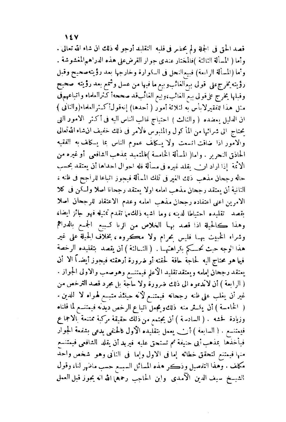 وَأَمَّا (الْمَسْأَلَةُ الْخَامِسَةُ) فَالْمُتَعَبِّدُ بِمَذْهَبِ الشَّافِعِيِّ أَوْ غَيْرِهِ مِنْ الْأَئِمَّةِ إذَا أَرَادَ أَنْ يُقَلِّدَ غَيْرَهُ فِي مَسْأَلَةٍ فَلَهُ أَحْوَالٌ: إحْدَاهَا أَنْ يَعْتَقِدَ بِحَسَبِ حَالِهِ رُجْحَانَ مَذْهَبِ ذَلِكَ الْغَيْرِ فِي تِلْكَ الْمَسْأَلَةِ فَيَجُوزُ اتِّبَاعًا لِلرَّاجِحِ فِي ظَنِّهِ، الثَّانِيَةُ أَنْ يَعْتَقِدَ رُجْحَانَ مَذْهَبِ إمَامِهِ أَوْ لَا يَعْتَقِدَ رُجْحَانًا أَصْلًا وَلَكِنْ فِي كِلَا الْأَمْرَيْنِ أَعْنِي اعْتِقَادَهُ رُجْحَانَ مَذْهَبِ إمَامِهِ وَعَدَمَ الِاعْتِقَادِ لِلرُّجْحَانِ أَصْلًا بِقَصْدِ تَقْلِيدِهِ احْتِيَاطًا لِدِينِهِ، وَمَا أَشْبَهَ ذَلِكَ مِمَّا تَقَدَّمَ تَمْثِيلُهُ فَهُوَ جَائِزٌ أَيْضًا، وَهَذَا كَالْحِيلَةِ إذَا قُصِدَ بِهَا الْخَلَاصُ مِنْ الرِّبَا كَبَيْعِ الْجَمْعِ بِالدَّرَاهِمِ وَشِرَاءِ الْخَبِيثِ بِهَا فَلَيْسَ بِحَرَامٍ وَلَا مَكْرُوهٍ، بِخِلَافِ الْحِيلَةِ عَلَى غَيْرِ هَذَا الْوَجْهِ حَيْثُ نَحْكُمُ بِكَرَاهَتِهَا.