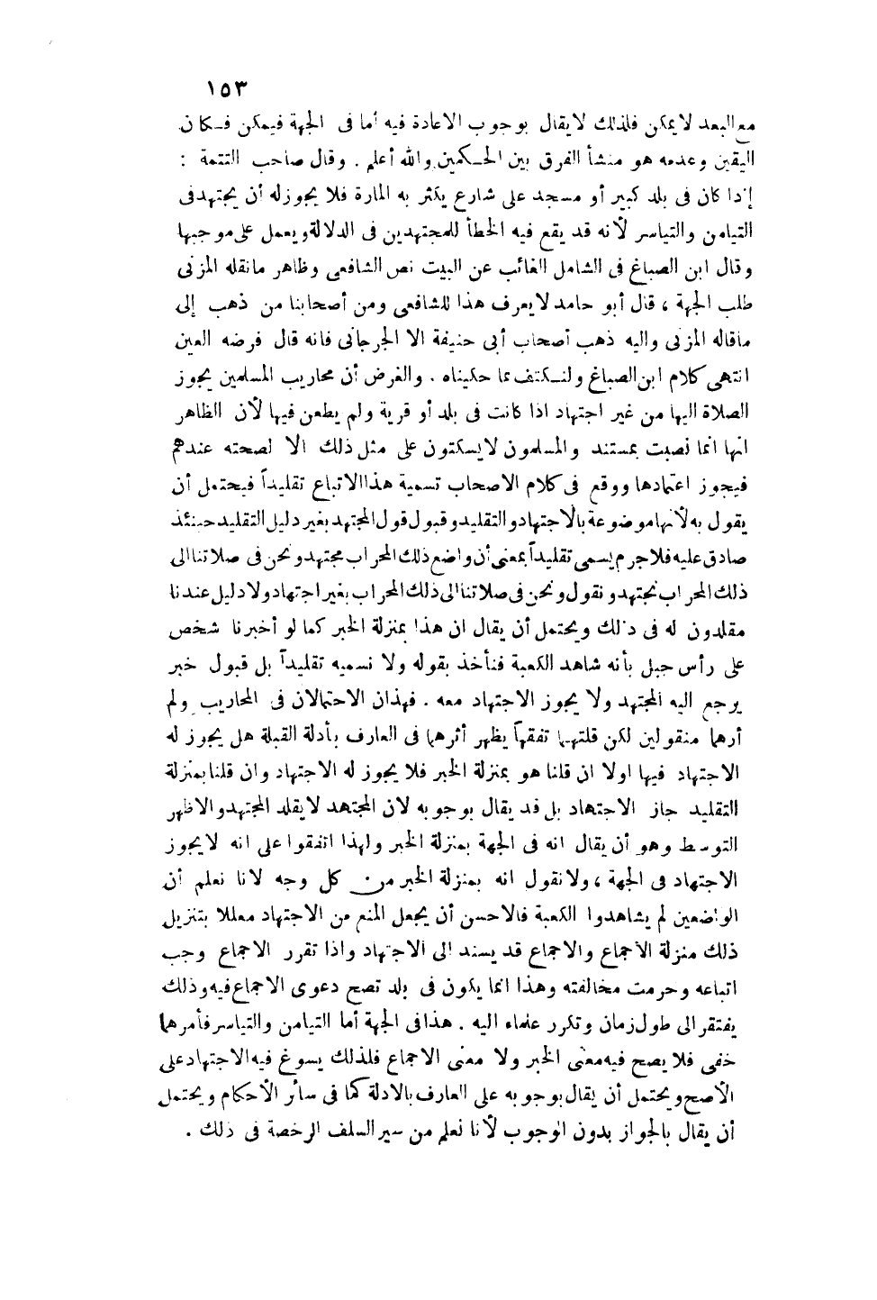 مَعَ الْبُعْدِ لَا يُمْكِنُ فَلِذَلِكَ لَا يُقَالُ بِوُجُوبِ الْإِعَادَةِ فِيهِ أَمَّا فِي الْجِهَةِ فَيُمْكِنُ فَكَانَ الْيَقِينُ وَعَدَمُهُ هُوَ مَنْشَأُ الْفَرْقِ بَيْنَ الْحُكْمَيْنِ وَاَللَّهُ أَعْلَمُ.