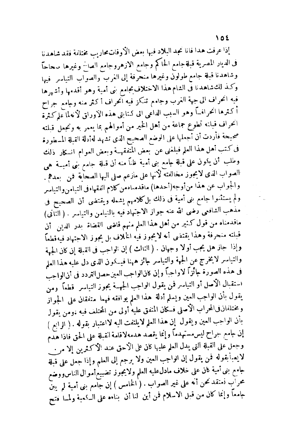 إذَا عَرَفْت هَذَا فَإِنَّا نَجِدُ الْبِلَادَ فِيهَا بَعْضَ الْأَوْقَاتِ مَحَارِيبُ مُخْتَلِفَةٌ فَقَدْ شَاهَدْنَا فِي الدِّيَارِ الْمِصْرِيَّةِ قِبْلَةَ جَامِعِ الْحَاكِمِ وَجَامِعِ الْأَزْهَرِ وَجَامِعِ الصَّالِحِ وَغَيْرِهَا صِحَاحًا وَشَاهَدْنَا قِبْلَةَ جَامِعِ طُولُونَ وَغَيْرَهَا مُنْحَرِفَةً إلَى الْغَرْبِ وَالصَّوَابُ التَّيَاسُرُ فِيهَا وَكَذَلِكَ شَاهَدْنَا فِي الشَّامِ هَذَا الِاخْتِلَافَ بِجَامِعِ بَنِي أُمَيَّةَ وَهُوَ أَقْدَمُهَا وَأَشْهَرُهَا فِيهِ انْحِرَافٌ إلَى جِهَةِ الْغَرْبِ وَجَامِعُ تَنْكُزَ فِيهِ انْحِرَافٌ أَكْثَرُ مِنْهُ وَجَامِعُ جَرَّاحٍ أَكْثَرُهَا انْحِرَافًا وَهُوَ السَّبَبُ الدَّاعِي إلَى كِتَابَتِي هَذِهِ الْأَوْرَاقَ لِأَنَّهُ لَمَّا عُلِمَ كَثْرَةُ انْحِرَافِ قِبْلَتِهِ تَطَوَّعَ جَمَاعَةٌ مِنْ أَهْلِ الْخَيْرِ مِنْ أَمْوَالِهِمْ بِمَا يَعْمُرُ بِهِ وَتُجْعَلُ قِبْلَتُهُ صَحِيحَةً فَأَرَدْت أَنْ أَجْعَلَهَا عَلَى الْوَضْعِ الصَّحِيحِ الَّذِي تَشْهَدُ لَهُ أَدِلَّةُ الْقِبْلَةِ الْمَسْطُورَةِ فِي كُتُبِ أَهْلِ هَذَا الْعِلْمِ فَبَلَغَنِي عَنْ بَعْضِ الْمُتَفَقِّهَةِ وَبَعْضِ الْعَوَامّ إنْكَارُ ذَلِكَ وَطَلَبُ أَنْ يَكُونَ عَلَى قِبْلَةِ جَامِعِ بَنِي أُمَيَّةَ ظَنًّا مِنْهُ أَنَّ قِبْلَةَ جَامِعِ بَنِي أُمَيَّةَ هِيَ الصَّوَابُ الَّذِي لَا يَجُوزُ مُخَالَفَتُهُ لِأَنَّهَا عَلَى مَا زَعَمَ صَلَّى إلَيْهَا الصَّحَابَةُ فَمَنْ بَعْدَهُمْ.