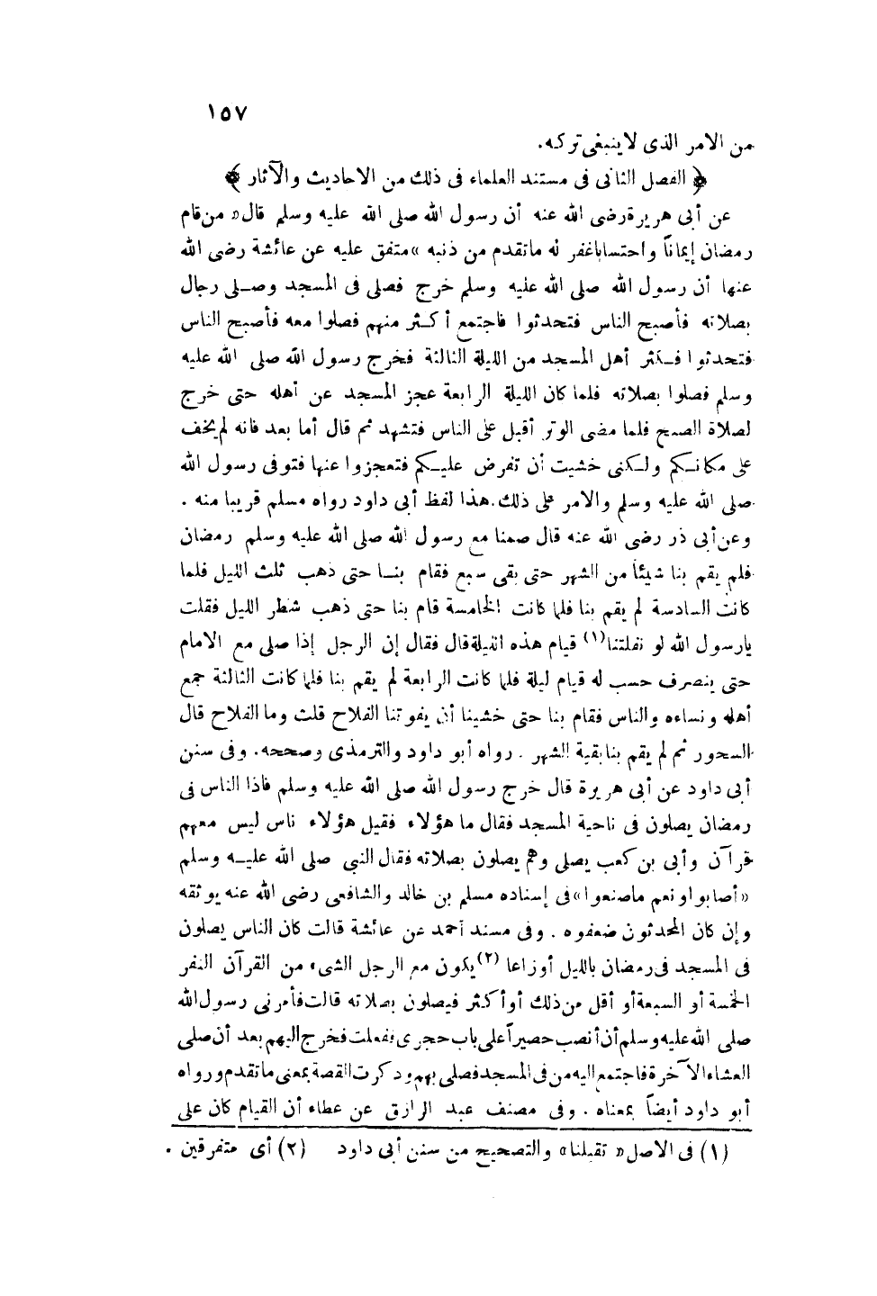 وَفِي سُنَنِ أَبِي دَاوُد عَنْ أَبِي هُرَيْرَةَ قَالَ: «خَرَجَ رَسُولُ اللَّهِ - صَلَّى اللَّهُ عَلَيْهِ وَسَلَّمَ - فَإِذَا النَّاسُ فِي رَمَضَانَ يُصَلُّونَ فِي نَاحِيَةِ الْمَسْجِدِ فَقَالَ مَا هَؤُلَاءِ؟ فَقِيلَ: هَؤُلَاءِ نَاسٌ لَيْسَ مَعَهُمْ قُرْآنٌ وَأُبَيُّ بْنُ كَعْبٍ يُصَلِّي وَهُمْ يُصَلُّونَ بِصَلَاتِهِ فَقَالَ النَّبِيُّ - صَلَّى اللَّهُ عَلَيْهِ وَسَلَّمَ - أَصَابُوا وَنِعْمَ مَا صَنَعُوا» فِي إسْنَادِهِ مُسْلِمُ بْنُ خَالِدٍ وَالشَّافِعِيُّ - رَضِيَ اللَّهُ عَنْهُ - يُوَثِّقُهُ وَإِنْ كَانَ الْمُحَدِّثُونَ ضَعَّفُوهُ.
