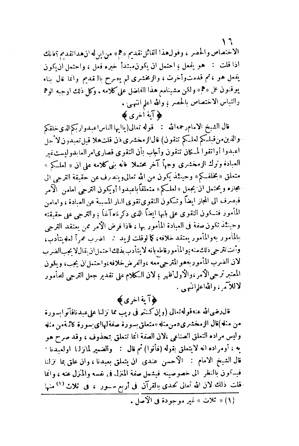 قَالَ الشَّيْخُ الْإِمَامُ - رَحِمَهُ اللَّهُ -: قَوْله تَعَالَى {يَا أَيُّهَا النَّاسُ اعْبُدُوا رَبَّكُمُ الَّذِي خَلَقَكُمْ وَالَّذِينَ مِنْ قَبْلِكُمْ لَعَلَّكُمْ تَتَّقُونَ} [البقرة: 21] قَالَ الزَّمَخْشَرِيُّ فَإِنْ قُلْت هَلَّا قِيلَ تَعْبُدُونَ لِأَجْلِ اُعْبُدُوا أَوْ اتَّقُوا لِمَكَانِ تَتَّقُونَ وَأَجَابَ بِأَنَّ التَّقْوَى قُصَارَى أَمْرِ الْعَابِدِ وَلَيْسَتْ غَيْرَ الْعِبَادَةِ وَتَرَكَ الزَّمَخْشَرِيُّ وَجْهًا آخَرَ مُحْتَمَلًا فَإِنَّهُ بَنَى كَلَامَهُ عَلَى أَنَّ " لَعَلَّكُمْ " مُتَعَلِّقٌ " بِخَلَقَكُمْ " وَحِينَئِذٍ يَكُونُ مِنْ اللَّهِ تَعَالَى وَيَنْصَرِفُ عَنْ حَقِيقَةِ التَّرَجِّي إلَى مَجَازِهِ وَيُحْتَمَلُ أَنْ يَجْعَلَ " لَعَلَّكُمْ " مُتَعَلِّقًا بِاعْبُدُوا أَوْ يَكُونُ التَّرَجِّي إمَّا مِنْ الْأَمْرِ فَيُصْرَفُ إلَى الْمَجَازِ أَيْضًا وَتَكُونُ التَّقْوَى تَقْوَى النَّارِ الْمُسَبَّبَةِ عَنْ الْعِبَادَةِ، وَإِمَّا مِنْ الْمَأْمُورِ فَتَكُونُ التَّقْوَى عَلَى بَابِهَا أَيْضًا الَّذِي ذَكَرْنَاهُ آنِفًا؛ وَالتَّرَجِّي عَلَى حَقِيقَتِهِ وَحِينَئِذٍ تَكُونُ صِفَةً فِي الْعِبَادَةِ الْمَأْمُورِ بِهَا، فَإِذَا فُرِضَ الْأَمْرُ مِمَّنْ يَعْتَقِدُ التَّرَجِّيَ بِالْمَأْمُورِ بِهِ وَالْمَأْمُورُ يَعْتَقِدُ خِلَافَهُ، كَمَا لَوْ قُلْتَ لِزَيْدٍ: اضْرِبْ عَمْرًا لَعَلَّهُ يَتَأَدَّبُ، وَأَنْتَ تَتَرَجَّى ذَلِكَ مِنْهُ؛ وَالْمَأْمُورُ قَاطِعٌ بِأَنَّهُ لَا يَتَأَدَّبُ بِذَلِكَ احْتَمَلَ أَنْ يُقَالَ لَا يَجِبُ الضَّرْبُ لِأَنَّ الضَّرْبَ الْمَأْمُورَ بِهِ هُوَ الْمُتَرَجَّى مَعَهُ، وَالْفَرْضُ خِلَافُهُ، وَاحْتَمَلَ أَنْ يَجِبَ، وَيَكُونُ الْمُعْتَبَرُ تَرَجِّيَ الْأَمْرِ، وَالْأَوَّلُ أَظْهَرُ؛ لِأَنَّ الْكَلَامَ عَلَى تَقْدِيرِ جَعْلِ التَّرَجِّي لِلْمَأْمُورِ لَا لِلْآمِرِ، وَاَللَّهُ أَعْلَمُ انْتَهَى.