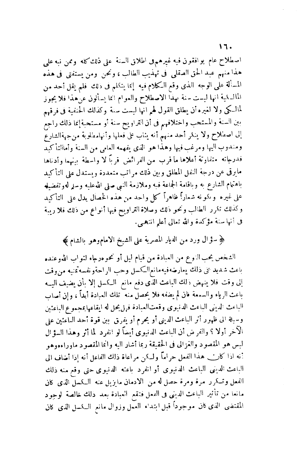 (سُؤَالٌ وَرَدٌّ مِنْ الدِّيَارِ الْمِصْرِيَّةِ عَلَى الشَّيْخِ الْإِمَامِ وَهُوَ بِالشَّامِ) الشَّخْصُ يُحِبُّ النَّوْعَ مِنْ الْعِبَادَةِ مِنْ قِيَامِ لَيْلٍ أَوْ نَحْوِهِ رَجَاءً لِثَوَابِ اللَّهِ وَعِنْدَهُ بَاعِثٌ شَدِيدٌ عَلَى ذَلِكَ يُعَارِضُهُ فِيهِ مَانِعُ الْكَسَلِ، وَحُبُّ الرَّاحَةِ، وَنَفْسُهُ تُمَنِّيهِ مِنْ وَقْتٍ إلَى وَقْتٍ فَلَا يَنْهَضُ ذَلِكَ الْبَاعِثُ الَّذِي دَفَعَ مَانِعَ الْكَسَلِ إلَّا بِأَنْ يُضِيفَ إلَيْهِ بَاعِثَ الرِّيَاءِ وَالسُّمْعَةِ فَإِنْ لَمْ يُضِفْهُ فَلَا يُحَصِّلُ مِنْهُ تِلْكَ الْعِبَادَةَ أَبَدًا، وَإِنْ أَصَابَ الْبَاعِثُ الدِّينِيُّ الْبَاعِثَ الدُّنْيَوِيَّ وَقَعَتْ الْعِبَادَةُ فَهَلْ يَحِلُّ لَهُ إيقَاعُهَا بِمَجْمُوعِ الْبَاعِثَيْنِ وَسِيلَةً إلَى ظُهُورِ أَثَرِ الْبَاعِثِ الدِّينِيِّ أَوْ يَحْرُمُ أَوْ يُفَرَّقُ بَيْنَ قُوَّةِ أَحَدِ الْبَاعِثَيْنِ عَلَى الْآخَرِ أَوْ لَا؟