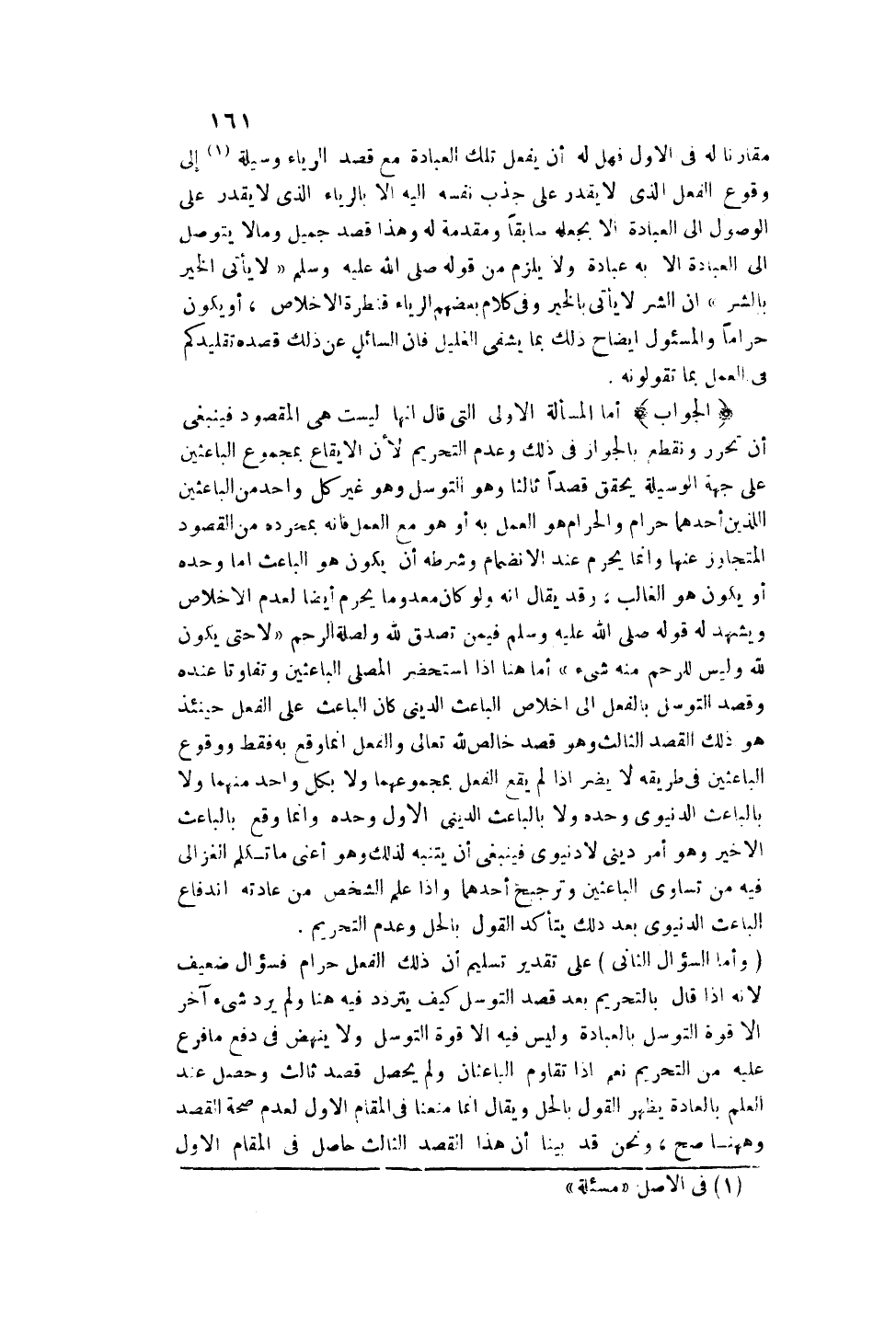 (الْجَوَابُ) أَمَّا الْمَسْأَلَةُ الْأُولَى الَّتِي قَالَ: إنَّهَا لَيْسَتْ هِيَ الْمَقْصُودُ فَيَنْبَغِي أَنْ تُحَرَّرَ وَنَقْطَعُ بِالْجَوَازِ فِي ذَلِكَ وَعَدَمِ التَّحْرِيمِ لِأَنَّ الْإِيقَاعَ بِمَجْمُوعِ الْبَاعِثَيْنِ عَلَى جِهَةِ الْوَسِيلَةِ يُحَقِّقُ قَصْدًا ثَالِثًا وَهُوَ التَّوَسُّلُ وَهُوَ غَيْرُ كُلِّ وَاحِدٍ مِنْ الْبَاعِثَيْنِ اللَّذَيْنِ أَحَدُهُمَا حَرَامٌ وَالْحَرَامُ هُوَ الْعَمَلُ بِهِ أَوْ هُوَ مَعَ الْعَمَلِ فَإِنَّهُ بِمُجَرَّدِهِ مِنْ الْقُصُودِ الْمُتَجَاوَزِ عَنْهَا وَإِنَّمَا يُحَرَّمُ عِنْدَ الِانْضِمَامِ وَشَرْطُهُ أَنْ يَكُونَ هُوَ الْبَاعِثُ إمَّا وَحْدَهُ أَوْ يَكُونَ هُوَ الْغَالِبُ، وَقَدْ يُقَالُ: إنَّهُ وَلَوْ كَانَ مَعْدُومًا يُحَرَّمُ أَيْضًا لِعَدَمِ الْإِخْلَاصِ وَيَشْهَدُ لَهُ قَوْلُهُ - صَلَّى اللَّهُ عَلَيْهِ وَسَلَّمَ - فِيمَنْ تَصَدَّقَ لِلَّهِ وَلِصِلَةِ الرَّحِمِ «لَا حَتَّى يَكُونَ لِلَّهِ وَلَيْسَ لِلرَّحِمِ مِنْهُ شَيْءٌ» أَمَّا هُنَا إذَا اسْتَحْضَرَ الْمُصَلِّي الْبَاعِثَيْنِ وَتَفَاوَتَا عِنْدَهُ وَقَصَدَ التَّوَسُّلَ بِالْفِعْلِ إلَى إخْلَاصِ الْبَاعِثِ الدِّينِيِّ كَانَ الْبَاعِثُ عَلَى الْفِعْلِ حِينَئِذٍ هُوَ ذَلِكَ الْقَصْدُ الثَّالِثُ وَهُوَ قَصْدٌ خَالِصٌ لِلَّهِ تَعَالَى وَالْفِعْلُ إنَّمَا وَقَعَ بِهِ فَقَطْ وَوُقُوعُ الْبَاعِثَيْنِ فِي طَرِيقِهِ لَا يَضُرُّ إذَا لَمْ يَقَعْ الْفِعْلُ بِمَجْمُوعِهِمَا وَلَا بِكُلِّ وَاحِدٍ مِنْهُمَا وَلَا بِالْبَاعِثِ الدُّنْيَوِيِّ وَحْدَهُ وَلَا بِالْبَاعِثِ الدِّينِيِّ الْأَوَّلِ وَحْدَهُ وَإِنَّمَا وَقَعَ بِالْبَاعِثِ الْأَخِيرِ وَهُوَ أَمْرٌ دِينِيٌّ لَا دُنْيَوِيٌّ فَيَنْبَغِي أَنْ يَتَنَبَّهَ لِذَلِكَ وَهُوَ أَعْنِي مَا تَكَلَّمَ الْغَزَالِيُّ فِيهِ مِنْ تَسَاوِي الْبَاعِثَيْنِ وَتَرْجِيحِ أَحَدِهِمَا وَإِذَا عُلِمَ الشَّخْصُ مِنْ عَادَتِهِ انْدِفَاعُ الْبَاعِثِ الدُّنْيَوِيِّ بَعْدَ ذَلِكَ يَتَأَكَّدُ الْقَوْلُ بِالْحِلِّ وَعَدَمِ التَّحْرِيمِ.