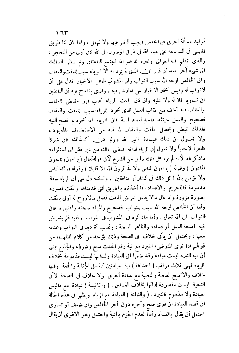 تَوْلِيدُ مَسْأَلَةٍ أُخْرَى فِيهَا تَخَلُّصٌ فَيَجِبُ النَّظَرُ فِيهَا وَلَا تُهْمَلُ وَإِذَا كَانَ لَنَا طَرِيقٌ فِقْهِيٌّ فِي التَّوْسِعَةِ عَلَى عِبَادِ اللَّهِ فِي طُرُقِ الْوُصُولِ إلَى اللَّهِ كَانَ أَوْلَى مِنْ التَّحَجُّرِ، وَاَلَّذِي تَكَلَّمَ فِيهِ الْغَزَالِيُّ وَغَيْرُهُ إنَّمَا هُوَ إذَا اجْتَمَعَ الْبَاعِثَانِ وَلَمْ يَنْظُرْ السَّالِكُ إلَى شَيْءٍ آخَرَ بَعْدَ أَنْ قَرَّرَ أَنَّ الَّذِي لَمْ يُرَدْ بِهِ إلَّا الرِّيَاءُ سَبَبٌ لِلْمَقْتِ وَالْعِقَابِ وَإِنَّ الْخَالِصَ لِوَجْهِ اللَّهِ سَبَبُ الثَّوَابِ وَإِنَّ الْمَشُوبَ ظَاهِرُ الْأَخْبَارِ تَدُلُّ عَلَى أَنْ لَا ثَوَابَ لَهُ وَلَيْسَ تَخْلُو الْأَخْبَارُ عَنْ تَعَارُضٍ فِيهِ وَاَلَّذِي يَنْقَدِحُ فِيهِ أَنَّ الْبَاعِثَيْنِ إنْ تَسَاوَيَا فَلَا لَهُ وَلَا عَلَيْهِ وَإِنْ كَانَ بَاعِثُ الرِّيَاءِ أَغْلَبَ فَهُوَ مُقْتَضٍ لِلْعِقَابِ وَالْعِقَابُ فِيهِ أَخَفُّ مِنْ عِقَابِ الْعَمَلِ الَّذِي تَجَرَّدَ لِلرِّيَاءِ سَبَبٌ لِلْمَقْتِ وَالْعِقَابِ فَصَحِيحٌ وَالْعَمَلُ حِينَئِذٍ فَاسِدٌ لِعَدَمِ النِّيَّةِ فَإِنَّ الرِّيَاءَ إذَا تَجَرَّدَ لَمْ تَصِحَّ النِّيَّةُ فَلِذَلِكَ تَبْطُلُ وَيَحْصُلُ الْمَقْتُ وَالْعِقَابُ لِمَا فِيهِ مِنْ الِاسْتِخْفَافِ بِالْمَعْبُودِ.