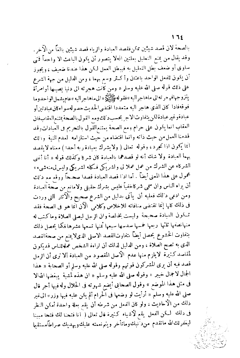 وَقَدْ قَدَّمْنَا الْعَمَلَ مِنْ حَيْثُ ذَاتُهُ وَإِنَّمَا اقْتَضَاهُ مِنْ حَيْثُ اسْتِلْزَامُهُ لِعَدَمِ النِّيَّةِ وَذَلِكَ إنَّمَا يَكُونُ إذَا تَجَرَّدَ وقَوْله تَعَالَى {وَلا يُشْرِكْ بِعِبَادَةِ رَبِّهِ أَحَدًا} [الكهف: 110] مَعْنَاهُ لَا يَقْصِدُ بِهِمَا الْعِبَادَةَ وَلَا شَكَّ أَنَّهُ لَوْ قَصَدَهُمَا بِالْعِبَادَةِ كَانَ شِرْكًا وَكَذَلِكَ قَوْلُهُ «أَنَا أَغْنَى الشُّرَكَاءِ عَنْ الشِّرْكِ مَنْ عَمِلَ عَمَلًا لِي وَلِشَرِيكِي فَكُلُّهُ لِشَرِيكِي وَلَيْسَ لِي مِنْهُ شَيْءٌ» مَحْمُولٌ عَلَى هَذَا الْمَعْنَى أَيْضًا. أَمَّا إذَا قَصَدَ الْعِبَادَةَ قَصْدًا صَحِيحًا وَوَقَعَ مَعَ ذَلِكَ أَنْ يَرَاهُ النَّاسُ وَإِنْ سُمِّيَ شِرْكًا خَفِيًّا فَلَيْسَ بِشِرْكٍ حَقِيقِيٍّ وَلَا مَانِعَ مِنْ صِحَّةِ الْعِبَادَةِ وَمَنْ ادَّعَى ذَلِكَ فَعَلَيْهِ أَنْ يَأْتِيَ بِدَلِيلٍ مِنْ الشَّرْعِ صَحِيحٍ وَالْآثَارُ الَّتِي وَرَدَتْ فِي ذَلِكَ كُلُّهَا إنَّمَا تَقْتَضِي مُنَافَاتَهُ لِلْإِخْلَاصِ وَكَلَامِي الْآنَ إنَّمَا هُوَ فِي الصِّحَّةِ فَقَدْ تَكُونُ الْعِبَادَةُ صَحِيحَةً وَلَيْسَتْ بِخَالِصَةٍ «وَإِنَّ الرَّجُلَ لَيُصَلِّي الصَّلَاةَ وَمَا كُتِبَ لَهُ مِنْهَا نِصْفُهَا ثُلُثُهَا رُبْعُهَا خُمُسُهَا سُدُسُهَا سُبْعُهَا ثُمُنُهَا تُسْعُهَا عُشْرُهَا» فَكَمَا يَحْصُلُ ذَلِكَ بِتَفَاوُتِ الْخُشُوعِ يَحْصُلُ أَيْضًا بِتَفَاوُتِ الْقَصْدِ الْأَصْلِيِّ الَّذِي لَا يَمْنَعُ مِنْ صِحَّةِ الْقَصْدِ الَّذِي بِهِ تَصِحُّ الصَّلَاةُ.