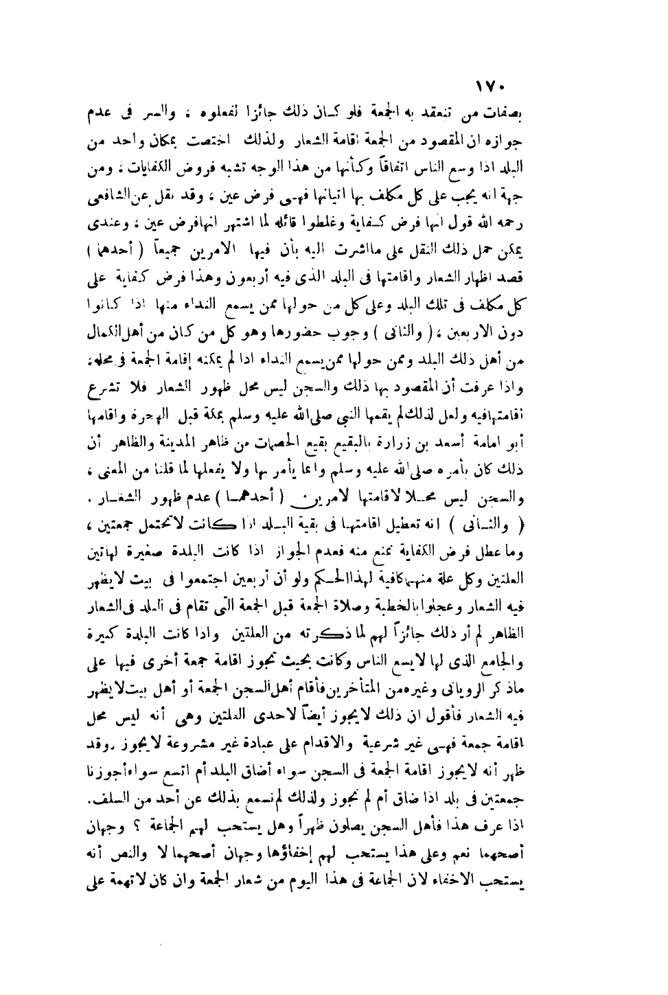 (وَالثَّانِي) وُجُوبُ حُضُورِهَا وَهُوَ كُلُّ مَنْ كَانَ مِنْ أَهْلِ الْكَمَالِ مِنْ أَهْلِ ذَلِكَ الْبَلَدِ وَمِمَّنْ حَوْلَهَا مِمَّنْ يَسْمَعُ النِّدَاءَ إذَا لَمْ يُمْكِنْهُ إقَامَةُ الْجُمُعَةِ فِي مَحِلِّهِ، وَإِذَا عَرَفْت أَنَّ الْمَقْصُودَ بِهَا ذَلِكَ وَالسِّجْنُ لَيْسَ مَحَلَّ ظُهُورِ الشِّعَارِ فَلَا تُشْرَعُ إقَامَتُهَا فِيهِ وَلَعَلَّ لِذَلِكَ لَمْ يُقِمْهَا النَّبِيُّ - صَلَّى اللَّهُ عَلَيْهِ وَسَلَّمَ - بِمَكَّةَ قَبْلَ الْهِجْرَةِ وَأَقَامَهَا أَبُو أُمَامَةَ أَسْعَدُ بْنُ زُرَارَةَ بِالْبَقِيعِ بَقِيعِ الْحَصَمَاتِ مِنْ ظَاهِرِ الْمَدِينَةِ وَالظَّاهِرُ أَنَّ ذَلِكَ كَانَ بِأَمْرِهِ - صَلَّى اللَّهُ عَلَيْهِ وَسَلَّمَ - وَإِنَّمَا يَأْمُرُ بِهَا وَلَا يَفْعَلُهَا لِمَا قُلْنَا مِنْ الْمَعْنَى، وَالسِّجْنُ لَيْسَ مَحَلًّا لِإِقَامَتِهَا لِأَمْرَيْنِ: (أَحَدُهُمَا) عَدَمُ ظُهُورِ الشِّعَارِ.