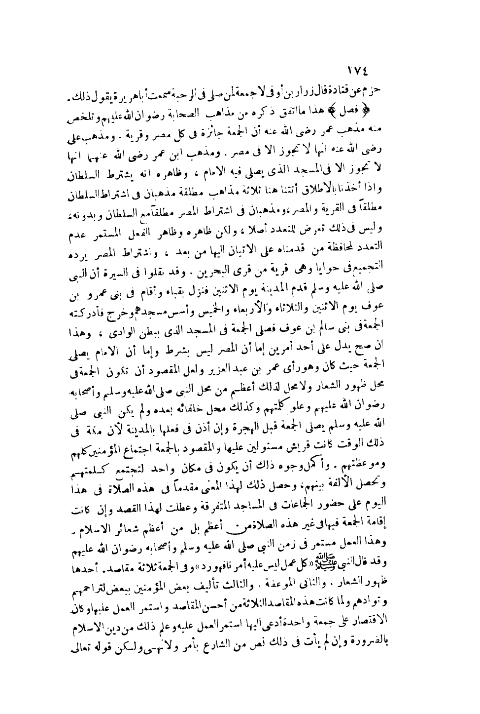 (فَصْلٌ) هَذَا مَا اتَّفَقَ ذِكْرُهُ مِنْ مَذَاهِبِ الصَّحَابَةِ - رِضْوَانُ اللَّهِ عَلَيْهِمْ - وَتَلَخَّصَ مِنْهُ مَذْهَبُ عُمَرَ - رَضِيَ اللَّهُ عَنْهُ - أَنَّ الْجُمُعَةَ جَائِزَةٌ فِي كُلِّ مِصْرٍ وَقَرْيَةٍ. وَمَذْهَبُ عَلِيٍّ - رَضِيَ اللَّهُ عَنْهُ - أَنَّهَا لَا تَجُوزُ إلَّا فِي مِصْرٍ. وَمَذْهَبُ ابْنِ عُمَرَ - رَضِيَ اللَّهُ عَنْهُمَا - أَنَّهَا لَا تَجُوزُ إلَّا فِي الْمَسْجِدِ الَّذِي يُصَلِّي فِيهِ الْإِمَامُ، وَظَاهِرُهُ أَنَّهُ يَشْتَرِطُ السُّلْطَانَ وَإِذَا أَخَذْنَا بِالْإِطْلَاقِ أَتَتْنَا هُنَا ثَلَاثَةُ مَذَاهِبَ مُطْلَقَةٌ مَذْهَبَانِ فِي اشْتِرَاطِ السُّلْطَانِ مُطْلَقًا فِي الْقَرْيَةِ وَالْمِصْرِ، وَمَذْهَبَانِ فِي اشْتِرَاطِ الْمِصْرِ مُطْلَقًا مَعَ السُّلْطَانِ وَبِدُونِهِ، وَلَيْسَ فِي ذَلِكَ تَعَرُّضٌ لِلتَّعَدُّدِ أَصْلًا، وَلَكِنَّ ظَاهِرَهُ وَظَاهِرَ الْفِعْلِ الْمُسْتَمِرِّ عَدَمُ التَّعَدُّدِ لِمُحَافَظَةِ مَنْ قَدَّمْنَاهُ عَلَى الْإِتْيَانِ إلَيْهَا مِنْ بُعْدٍ، وَاشْتِرَاطُ الْمِصْرِ يَرُدُّهُ التَّجْمِيعُ فِي حَوَايَا وَهِيَ قَرْيَةٌ مِنْ قُرَى الْبَحْرَيْنِ.