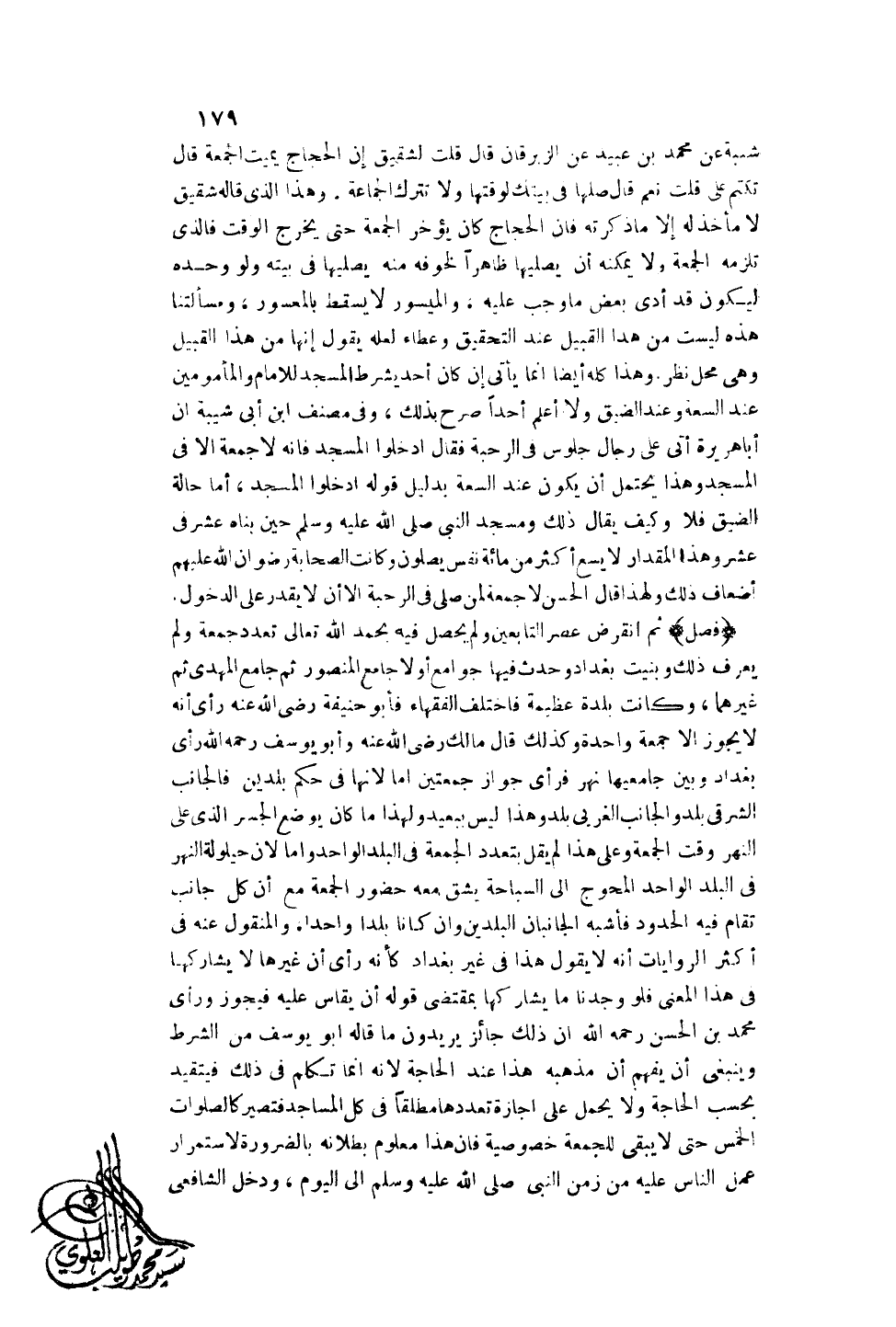 (فَصْلٌ) ثُمَّ انْقَرَضَ عَصْرُ التَّابِعِينَ وَلَمْ يَحْصُلْ فِيهِ بِحَمْدِ اللَّهِ تَعَالَى تَعَدُّدُ جُمُعَةٍ وَلَمْ يُعْرَفْ ذَلِكَ وَبُنِيَتْ بَغْدَادُ وَحَدَثَ فِيهَا جَوَامِعُ أَوَّلًا جَامِعُ الْمَنْصُورِ ثُمَّ جَامِعُ الْمَهْدِيِّ ثُمَّ غَيْرُهُمَا، وَكَانَتْ بَلْدَةً عَظِيمَةً فَاخْتَلَفَ الْفُقَهَاءُ فَأَبُو حَنِيفَةَ - رَضِيَ اللَّهُ عَنْهُ - رَأَى أَنَّهُ لَا يَجُوزُ إلَّا جُمُعَةٌ وَاحِدَةٌ وَكَذَلِكَ قَالَ مَالِكٌ - رَضِيَ اللَّهُ عَنْهُ - وَأَبُو يُوسُفَ - رَحِمَهُ اللَّهُ - رَأَى بَغْدَادَ وَبَيْنَ جَامِعِيهَا نَهْرٌ فَرَأَى جَوَازَ جُمُعَتَيْنِ إمَّا لِأَنَّهَا فِي حُكْمِ بَلَدَيْنِ فَالْجَانِبُ الشَّرْقِيُّ بَلَدٌ وَالْجَانِبُ الْغَرْبِيُّ بَلَدٌ وَهَذَا لَيْسَ بِبَعِيدٍ وَلِهَذَا مَا كَانَ يُوضَعُ الْجِسْرُ الَّذِي عَلَى النَّهْرِ وَقْتَ الْجُمُعَةِ وَعَلَى هَذَا لَمْ يَقُلْ بِتَعَدُّدِ الْجُمُعَةِ فِي الْبَلَدِ الْوَاحِدِ وَإِمَّا لِأَنَّ حَيْلُولَةَ النَّهْرِ فِي الْبَلَدِ الْوَاحِدِ الْمُحْوِجِ إلَى السِّبَاحَةِ يَشُقُّ مَعَهُ حُضُورُ الْجُمُعَةِ مَعَ أَنَّ كُلَّ جَانِبٍ تُقَامُ فِيهِ الْحُدُودُ فَأَشْبَهَ الْجَانِبَانِ الْبَلَدَيْنِ وَإِنْ كَانَا بَلَدًا وَاحِدًا، وَالْمَنْقُولُ عَنْهُ فِي أَكْثَرِ الرِّوَايَاتِ أَنَّهُ لَا يَقُولُ هَذَا فِي غَيْرِ بَغْدَادَ كَأَنَّهُ رَأَى أَنَّ غَيْرَهَا لَا يُشَارِكُهَا فِي هَذَا الْمَعْنَى فَلَوْ وَجَدْنَا مَا يُشَارِكُهَا بِمُقْتَضَى قَوْلِهِ أَنْ يُقَاسَ عَلَيْهِ فَيَجُوزُ وَرَأْيُ مُحَمَّدِ بْنِ الْحَسَنِ - رَحِمَهُ اللَّهُ - أَنَّ ذَلِكَ جَائِزٌ يُرِيدُونَ مَا قَالَهُ أَبُو يُوسُفَ مِنْ الشَّرْطِ وَيَنْبَغِي أَنْ يُفْهَمَ أَنَّ مَذْهَبَهُ هَذَا عِنْدَ الْحَاجَةِ لِأَنَّهُ إنَّمَا تَكَلَّمَ فِي ذَلِكَ فَيَتَقَيَّدُ بِحَسَبِ الْحَاجَةِ وَلَا يُحْمَلُ عَلَى إجَازَةِ تَعَدُّدِهَا مُطْلَقًا فِي كُلِّ الْمَسَاجِدِ فَتَصِيرُ كَالصَّلَوَاتِ الْخَمْسِ حَتَّى لَا يَبْقَى لِلْجُمُعَةِ خُصُوصِيَّةٌ.
