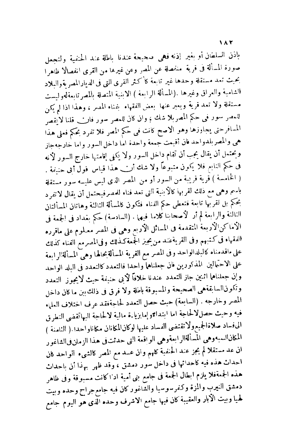 (الثَّامِنَةُ) : الْمَكَانُ، الْأَبْنِيَةُ وَهِيَ الْمَسْأَلَةُ الرَّابِعَةُ وَهِيَ الْوَاقِعَةُ الَّتِي حَدَثَتْ فِي هَذَا الزَّمَانِ فِي الشَّاغُورِ إنْ عُدَّ مُسْتَقِلًّا لَمْ يَجُزْ عِنْدَ الْحَنَفِيَّةِ كُلِّهِمْ وَإِنْ عُدَّ مَعَ الْمِصْرِ كَالشَّيْءِ الْوَاحِدِ كَانَ إحْدَاثُ هَذِهِ فِيهِ كَإِحْدَاثِهَا فِي دَاخِلِ سُورِ دِمَشْقَ، وَقَدْ ظَهَرَ بِهَذَا أَنَّ بِإِحْدَاثِ هَذِهِ الْجُمُعَةِ فَلَا يَلْزَمُ إبْطَالُ الْجُمُعَةِ فِي جَامِعِ بَنِي أُمَيَّةَ إذَا كَانَتْ مَسْبُوقَةً وَفِي ظَاهِرِ دِمَشْقَ النَّيْرَبِ وَالْمِزَّةِ وَكَفْرِ سُوسِيَّا وَالشَّاغُورِ كَانَ فِيهِ جَامِعُ جَرَّاحٍ وَحْدَهُ وَبَيْتُ لَهْيَا وَبَيْتُ الْآبَارِ وَالْعُقَيْبَةُ كَانَ فِيهَا جَامِعُ الْأَشْرَفِ وَحْدَهُ الَّذِي هُوَ الْيَوْمَ جَامِعُ الْعُقَيْبَةِ.