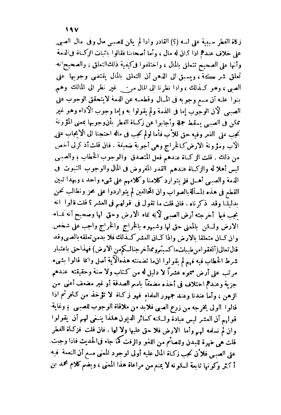 زَكَاةِ الْفِطْرِ سَبَبِيَّةً عَلَى لَبَّةِ (؟) الْقَادِرِ وَإِذَا لَمْ يَكُنْ لِلصَّبِيِّ مَالٌ وَفِي مَالِ الصَّبِيِّ عَلَى خِلَافٍ عِنْدَهُمْ إذَا كَانَ لَهُ مَالٌ، وَأَمَّا أَصْحَابُنَا فَقَالُوا بِإِثْبَاتِ الزَّكَاةِ فِي الذِّمَّةِ وَإِنَّهَا عَلَى الصَّحِيحِ تَتَعَلَّقُ بِالْمَالِ، وَاخْتَلَفُوا فِي كَيْفِيَّةِ ذَلِكَ التَّعَلُّقِ.