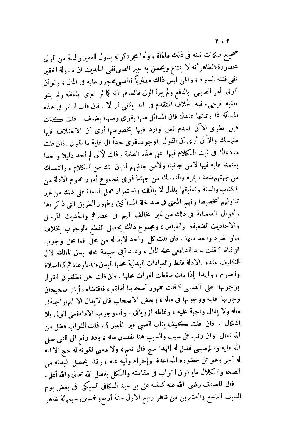 فَإِنْ قُلْتَ هَلْ: تُطْلِقُونَ الْقَوْلَ بِوُجُوبِهَا عَلَى الصَّبِيِّ؟ قُلْتُ: جُمْهُورُ أَصْحَابِنَا أَطْلَقُوهُ فَاقْتَضَاهُ رَأْيَانِ صَحِيحَانِ وُجُوبُهَا عَلَيْهِ وَوُجُوبُهَا فِي مَالِهِ، وَبَعْضُ الْأَصْحَابِ قَالَ لَا يُقَالُ إلَّا إنَّهَا وَاجِبَةٌ فِي مَالِهِ وَلَا يُقَالُ وَاجِبَةٌ عَلَيْهِ، وَغَلَّطَهُ الرُّويَانِيُّ. وَأَمَّا وُجُوبُ الْأَدَاءِ فَعَلَى الْوَلِيِّ بِلَا إشْكَالٍ. فَإِنْ قُلْت: كَيْفَ يُثَابُ الصَّبِيُّ غَيْرُ الْمُمَيِّزِ؟