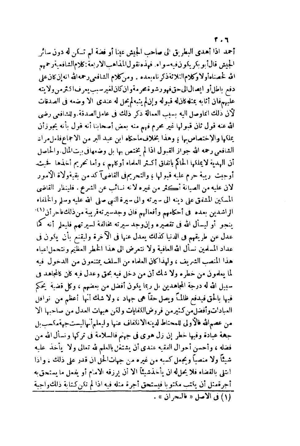فَهَذِهِ نُقُولُ الْمَذَاهِبِ الْأَرْبَعَةِ: كَلَامُ الشَّافِعِيَّةِ - رَحِمَهُمُ اللَّهُ - لَخَّصْنَاهُ أَوَّلًا وَكَلَامُ الثَّلَاثَةِ ذَكَرْنَاهُ بَعْدَهُ. وَمِنْ كَلَامِ الشَّافِعِيِّ - رَحِمَهُ اللَّهُ - أَنَّهُ إنْ كَانَ عَلَى دَفْعِ بَاطِلٍ أَوْ إيصَالٍ إلَى حَقٍّ فَهُوَ رِشْوَةٌ مُحَرَّمَةٌ وَإِنْ كَانَ لِغَيْرِ سَبَبٍ يُعْرَفُ أَكْثَرَ مِنْ وِلَايَتِهِ عَلَيْهِمْ فَإِنْ أَثَابَهُ بِمِثْلِهِ كَانَ لَهُ قَبُولُهُ وَإِنْ لَمْ يُثِبْهُ لَمْ يَحِلَّ لَهُ عِنْدِي إلَّا وَضْعُهُ فِي الصَّدَقَاتِ لِأَنَّ ذَلِكَ إنَّمَا وَصَلَ إلَيْهِ بِسَبَبِ الْعِمَالَةِ ذَكَرَ ذَلِكَ فِي عَامِلِ الصَّدَقَةِ.