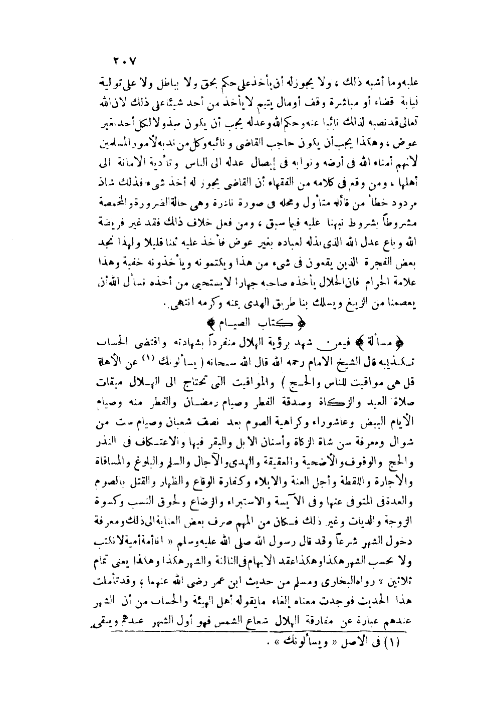 وَقَدْ قَالَ رَسُولُ اللَّهِ - صَلَّى اللَّهُ عَلَيْهِ وَسَلَّمَ - «إنَّا أُمَّةٌ أُمِّيَّةٌ لَا نَكْتُبُ وَلَا نَحْسُبُ الشَّهْرَ هَكَذَا وَهَكَذَا عَقَدَ الْإِبْهَامَ فِي الثَّالِثَةِ وَالشَّهْرُ هَكَذَا وَهَكَذَا يَعْنِي تَمَامَ ثَلَاثِينَ» رَوَاهُ الْبُخَارِيُّ وَمُسْلِمٌ مِنْ حَدِيثِ ابْنِ عُمَرَ - رَضِيَ اللَّهُ عَنْهُمَا -؛ وَقَدْ تَأَمَّلْت هَذَا الْحَدِيثَ فَوَجَدْت مَعْنَاهُ إلْغَاءَ مَا يَقُولُهُ أَهْلُ الْهَيْئَةِ وَالْحِسَابِ مِنْ أَنَّ الشَّهْرَ عِنْدَهُمْ عِبَارَةٌ عَنْ مُفَارَقَةِ الْهِلَالِ شُعَاعَ الشَّمْسِ فَهُوَ أَوَّلُ الشَّهْرِ عِنْدَهُمْ وَيَبْقَى