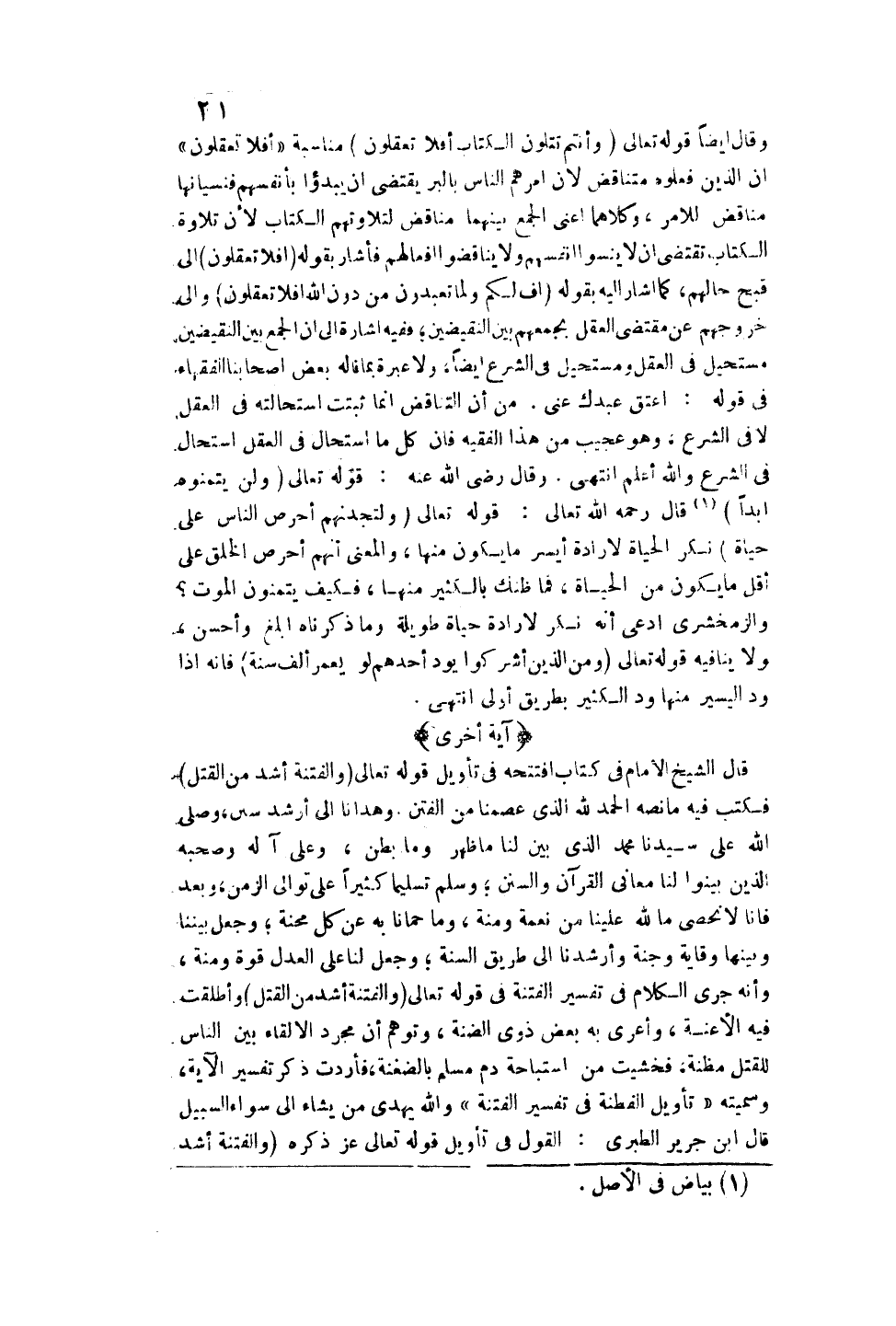 قَالَ الشَّيْخُ الْإِمَامُ فِي كِتَابٍ افْتَتَحَهُ فِي تَأْوِيلِ قَوْله تَعَالَى {وَالْفِتْنَةُ أَشَدُّ مِنَ الْقَتْلِ} [البقرة: 191] فَكَتَبَ فِيهِ مَا نَصُّهُ الْحَمْدُ لِلَّهِ الَّذِي عَصَمَنَا مِنْ الْفِتَنِ، وَهَدَانَا إلَى أَرْشَدِ سُنَنٍ، وَصَلَّى اللَّهُ عَلَى سَيِّدِنَا مُحَمَّدٍ الَّذِي بَيَّنَ لَنَا مَا ظَهَرَ وَمَا بَطَنَ، وَعَلَى آلِهِ وَصَحْبِهِ الَّذِينَ بَيَّنُوا لَنَا مَعَانِيَ الْقُرْآنِ وَالسُّنَنِ؛ وَسَلَّمَ تَسْلِيمًا كَثِيرًا عَلَى تَوَالِي الزَّمَنِ، وَبَعْدُ فَإِنَّا لَا نُحْصِي مَا لِلَّهِ عَلَيْنَا مِنْ نِعْمَةٍ وَمِنَّةٍ، وَمَا حَمَانَا بِهِ عَنْ كُلِّ مِحْنَةٍ؛ وَجَعَلَ بَيْنَنَا وَبَيْنَهَا وِقَايَةً وَجُنَّةً وَأَرْشَدَنَا إلَى طَرِيقِ السُّنَّةِ؛ وَجَعَلَ لَنَا عَلَى الْعَدْلِ قُوَّةً وَمِنَّةً، وَأَنَّهُ جَرَى الْكَلَامُ فِي تَفْسِيرِ الْفِتْنَةِ فِي قَوْله تَعَالَى {وَالْفِتْنَةُ أَشَدُّ مِنَ الْقَتْلِ} [البقرة: 191] وَأُطْلِقَتْ فِيهِ الْأَعِنَّةُ، وَأَعْرَى بِهِ بَعْضُ ذَوِي الضِّنَةِ، وَتَوَهَّمَ أَنَّ مُجَرَّدَ الْإِلْقَاءِ بَيْنَ النَّاسِ لِلْقَتْلِ مَظِنَّةٌ، فَخَشِيتُ مِنْ اسْتِبَاحَةِ دَمِ مُسْلِمٍ بِالضَّغِنَةِ، فَأَرَدْتُ ذِكْرَ تَفْسِيرِ الْآيَةِ، وَسَمَّيْته تَأْوِيلَ الْفِطْنَةِ فِي تَفْسِيرِ الْفِتْنَةِ " وَاَللَّهُ يَهْدِي مَنْ يَشَاءُ إلَى سَوَاءِ السَّبِيلِ قَالَ ابْنُ جَرِيرٍ الطَّبَرِيُّ: الْقَوْلُ فِي تَأْوِيلِ قَوْله تَعَالَى عَزَّ ذِكْرُهُ