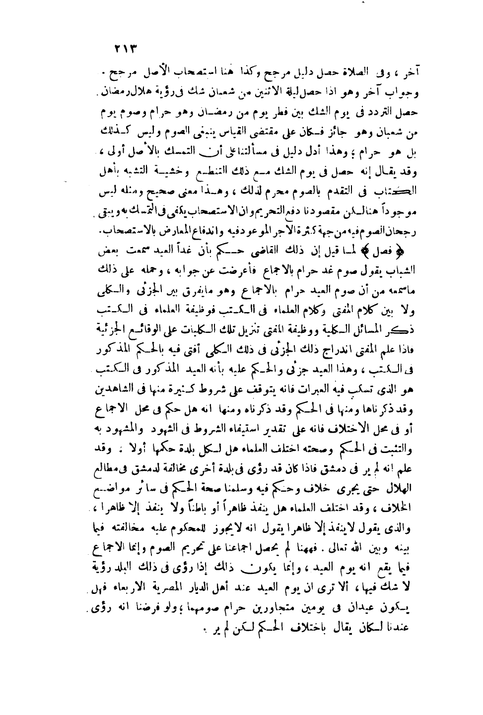 (فَصْلٌ) لَمَّا قِيلَ: إنَّ ذَلِكَ الْقَاضِيَ حَكَمَ بِأَنَّ غَدًا الْعِيدُ سَمِعْت بَعْضَ الشَّبَابِ يَقُولُ صَوْمُ غَدٍ حَرَامٌ بِالْإِجْمَاعِ فَأَعْرَضْت عَنْ جَوَابِهِ، وَحَمَلَهُ عَلَى ذَلِكَ مَا سَمِعَهُ مِنْ أَنَّ صَوْمَ الْعِيدِ حَرَامٌ بِالْإِجْمَاعِ وَهُوَ مَا يُفَرِّقُ بَيْنَ الْجُزْئِيِّ وَالْكُلِّيِّ وَلَا بَيْنَ كَلَامِ الْمُفْتِي وَكَلَامِ الْعُلَمَاءِ فِي الْكُتُبِ فَوَظِيفَةُ الْعُلَمَاءِ فِي الْكُتُبِ ذِكْرُ الْمَسَائِلِ الْكُلِّيَّةِ وَوَظِيفَةُ الْمُفْتِي تَنْزِيلُ تِلْكَ الْكُلِّيَّاتِ عَلَى الْوَقَائِعِ الْجُزْئِيَّةِ فَإِذَا عَلِمَ الْمُفْتِي انْدِرَاجَ ذَلِكَ الْجُزْئِيِّ فِي ذَلِكَ الْكُلِّيِّ أَفْتَى فِيهِ بِالْحُكْمِ الْمَذْكُورِ فِي الْكُتُبِ، وَهَذَا الْعِيدُ جُزْئِيٌّ وَالْحُكْمُ عَلَيْهِ بِأَنَّهُ الْعِيدُ الْمَذْكُورُ فِي الْكُتُبِ هُوَ الَّذِي تُسْكَبُ فِيهِ الْعَبَرَاتُ فَإِنَّهُ يَتَوَقَّفُ عَلَى شُرُوطٍ كَثِيرَةٍ مِنْهَا فِي الشَّاهِدَيْنِ وَقَدْ ذَكَرْنَاهَا وَمِنْهَا فِي الْحُكْمِ.