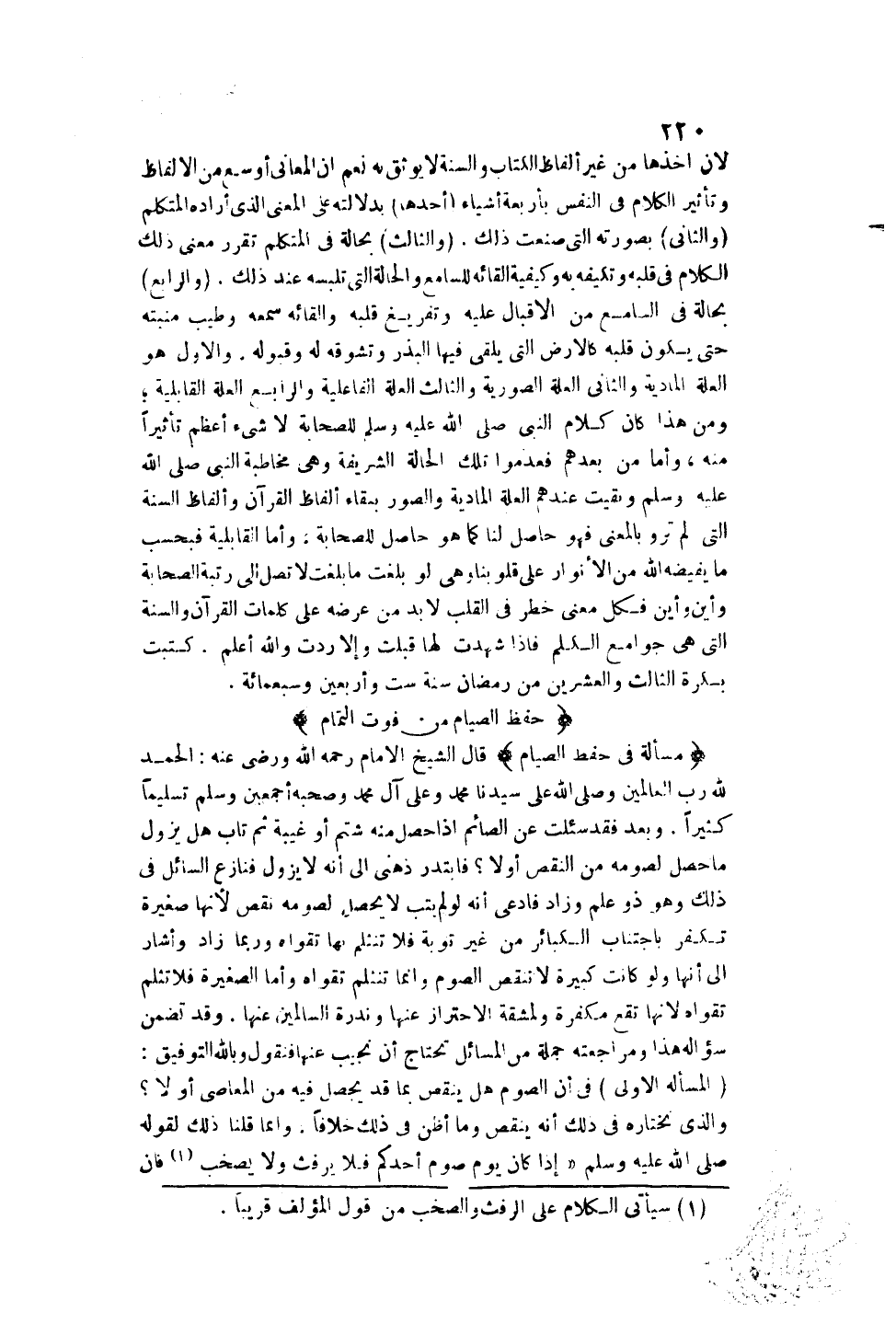 (مَسْأَلَةٌ فِي حِفْظِ الصِّيَامِ) قَالَ الشَّيْخُ الْإِمَامُ رَحِمَهُ اللَّهُ وَرَضِيَ عَنْهُ: الْحَمْدُ لِلَّهِ رَبِّ الْعَالَمِينَ وَصَلَّى اللَّهُ عَلَى سَيِّدِنَا مُحَمَّدٍ وَعَلَى آلِ مُحَمَّدٍ وَصَحْبِهِ أَجْمَعِينَ وَسَلَّمَ تَسْلِيمًا كَثِيرًا. وَبَعْدُ فَقَدْ سُئِلْت عَنْ الصَّائِمِ إذَا حَصَلَ مِنْهُ شَتْمٌ أَوْ غِيبَةٌ ثُمَّ تَابَ هَلْ يَزُولُ مَا حَصَلَ لِصَوْمِهِ مِنْ النَّقْصِ أَوْ لَا؟ فَابْتَدَرَ ذِهْنِي إلَى أَنَّهُ لَا يَزُولُ فَنَازَعَ السَّائِلُ فِي ذَلِكَ وَهُوَ ذُو عِلْمٍ وَزَادَ فَادَّعَى أَنَّهُ لَوْ لَمْ يَتُبْ لَا يَحْصُلُ لِصَوْمِهِ نَقْصٌ لِأَنَّهَا صَغِيرَةٌ تُكَفَّرُ بِاجْتِنَابِ الْكَبَائِرِ مِنْ غَيْرِ تَوْبَةٍ فَلَا تَنْثَلِمُ بِهَا تَقْوَاهُ.