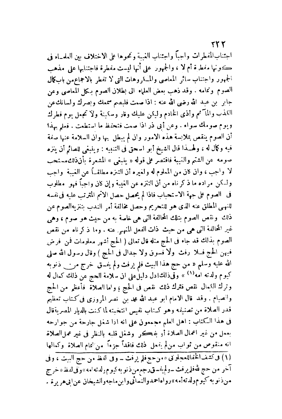 وَمَا ذَكَرْنَاهُ مِنْ نَقْصِ الصَّوْمِ بِذَلِكَ قَدْ جَاءَ فِي الْحَجِّ مِثْلُهُ قَالَ تَعَالَى {الْحَجُّ أَشْهُرٌ مَعْلُومَاتٌ فَمَنْ فَرَضَ فِيهِنَّ الْحَجَّ فَلا رَفَثَ وَلا فُسُوقَ وَلا جِدَالَ فِي الْحَجِّ} [البقرة: 197] وَقَالَ رَسُولُ اللَّهِ - صَلَّى اللَّهُ عَلَيْهِ وَسَلَّمَ - «مَنْ حَجَّ هَذَا الْبَيْتَ فَلَمْ يَرْفُثْ وَلَمْ يَفْسُقْ خَرَجَ مِنْ ذُنُوبِهِ كَيَوْمِ وَلَدَتْهُ أُمُّهُ» وَفِي ذَلِكَ أَدَلُّ دَلِيلٍ عَلَى أَنَّ سَلَامَةَ الْحَجِّ عَنْ ذَلِكَ كَمَالٌ لَهُ وَتَرْكُ الْكَمَالِ نَقْصٌ فَتَرْكُ ذَلِكَ نَقْصٌ فِي الْحَجِّ؛ وَأَمَّا الصَّلَاةُ فَأَعْظَمُ مِنْ الْحَجِّ وَالصِّيَامِ.