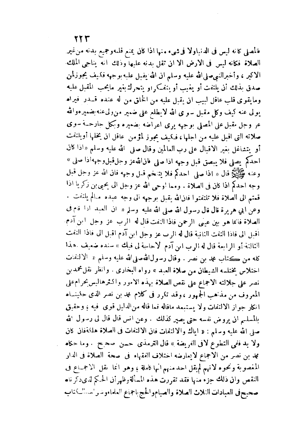 هَذَا كُلُّهُ مِنْ كِتَابِ مُحَمَّدِ بْنِ نَصْرٍ. وَقَالَ رَسُولُ اللَّهِ - صَلَّى اللَّهُ عَلَيْهِ وَسَلَّمَ - «الِالْتِفَاتُ اخْتِلَاسٌ يَخْتَلِسُهُ الشَّيْطَانُ مِنْ صَلَاةِ الْعَبْدِ» رَوَاهُ الْبُخَارِيُّ. وَانْظُرْ نَقْلَ مُحَمَّدُ بْنُ نَصْرٍ عَلَى جَلَالَتِهِ الْإِجْمَاعَ عَلَى نَقْصِ الصَّلَاةِ بِهَذِهِ الْأُمُورِ وَأَكْثَرُهَا لَيْسَ بِحَرَامٍ عَلَى الْمَعْرُوفِ مِنْ مَذَاهِبِ الْجُمْهُورِ، وَقَدْ تَكَرَّرَ فِي كَلَامِ مُحَمَّدِ بْنِ نَصْرٍ الَّذِي حَكَيْنَاهُ إنْكَارَ جَوَازِ الِالْتِفَاتِ وَلَا يُسْتَبْعَدُ مَا قَالَهُ فَمَا قَالَهُ مِنْ الدَّلِيلِ قَوِيٌّ فِيهِ؛ وَحَقِيقٌ بِالْمُسْلِمِ أَنْ يُرَوِّضَ نَفْسَهُ حَتَّى يَصِيرَ كَذَلِكَ.