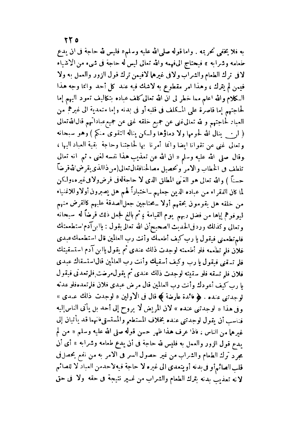 وَأَمَّا قَوْلُهُ - صَلَّى اللَّهُ عَلَيْهِ وَسَلَّمَ - «فَلَيْسَ لِلَّهِ حَاجَةٌ فِي أَنْ يَدَعَ طَعَامَهُ وَشَرَابَهُ» فَيَحْتَاجُ إلَى فَهْمِهِ وَاَللَّهُ تَعَالَى لَيْسَ لَهُ حَاجَةٌ فِي شَيْءٍ مِنْ الْأَشْيَاءِ لَا فِي تَرْكِ الطَّعَامِ وَالشَّرَابِ وَلَا فِي غَيْرِهِمَا لَا فِيمَنْ تَرَكَ قَوْلَ الزُّورِ وَالْعَمَلَ بِهِ وَلَا فِيمَنْ لَمْ يَتْرُكْ، وَهَذَا أَمْرٌ مَقْطُوعٌ بِهِ لَا شَكَّ فِيهِ عِنْدَ كُلِّ أَحَدٍ وَإِنَّمَا وَجْهُ هَذَا الْكَلَامِ وَاَللَّهُ أَعْلَمُ.