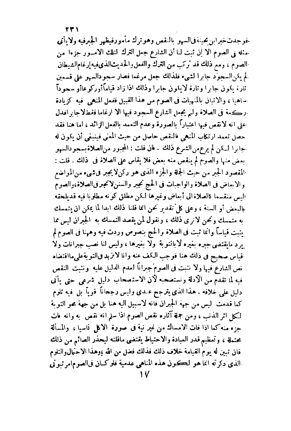 فَوَجَدْت خَبَرَ ابْنِ بُحَيْنَةَ فِي السَّهْوِ بِالنَّقْصِ وَهُوَ تَرْكُ مَأْمُورٍ فَيَظْهَرُ الْجَبْرُ فِيهِ وَلَا يَأْتِي مِثْلُهُ فِي الصَّوْمِ إلَّا إنْ ثَبَتَ لَنَا أَنَّ الشَّارِعَ جَعَلَ التَّرْكَ لِتِلْكَ الْأُمُورِ جُزْءًا مِنْ الصَّوْمِ، وَمَعَ ذَلِكَ قَدْ تُرَكَّبُ مِنْ التَّرْكِ وَالْفِعْلِ وَالْحَدِيثُ الَّذِي فِيهِ إرْغَامُ الشَّيْطَانِ لَمْ يَكُنْ السُّجُودُ جَابِرًا لِشَيْءٍ فَلِذَلِكَ جُعِلَ مُرْغَمًا فَصَارَ سُجُودُ السَّهْوِ عَلَى قِسْمَيْنِ: تَارَةً يَكُونُ جَابِرًا وَتَارَةً لَا يَكُونُ جَابِرًا وَذَلِكَ إذَا زَادَ قِيَامًا أَوْ رُكُوعًا أَوْ سُجُودًا سَاهِيًا، وَالْإِتْيَانُ بِالْمَنْهِيَّاتِ فِي الصَّوْمِ مِنْ هَذَا الْقَبِيلِ فَفِعْلُ الْمَنْهِيِّ فِيهِ كَزِيَادَةِ رَكْعَةٍ فِي الصَّلَاةِ وَلَمْ يَجْعَلْ الشَّارِعُ السُّجُودَ فِيهَا إلَّا إرْغَامًا فَقَطْ لَا جَابِرًا فَدَلَّ عَلَى أَنَّهُ لَا نَقْصَ فِيهَا اعْتِبَارًا بِالصُّورَةِ وَعَدَمِ التَّعَمُّدِ بِالْفِعْلِ الزَّائِدِ.