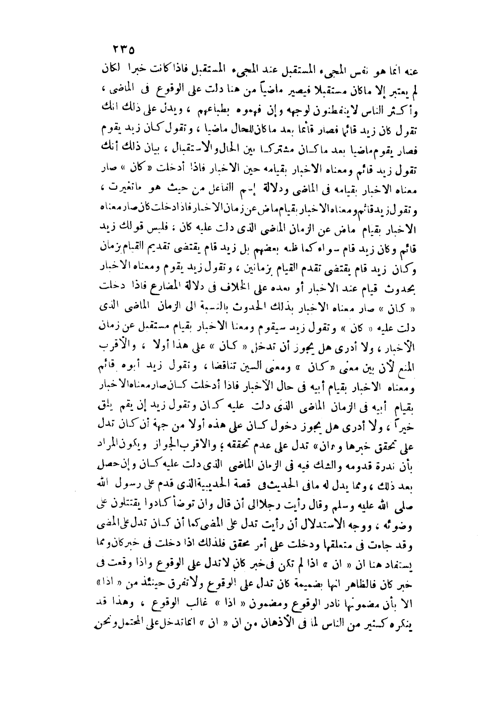 عَنْهُ إنَّمَا هُوَ نَفْسُ الْمَجِيءِ الْمُسْتَقْبَلِ عِنْدَ الْمَجِيءِ الْمُسْتَقْبَلِ فَإِذَا كَانَتْ خَبَرًا لَكَانَ لَمْ يُعْتَبَرْ إلَّا مَا كَانَ مُسْتَقْبَلًا فَيَصِيرُ مَاضِيًا مِنْ هُنَا دَلَّتْ عَلَى الْوُقُوعِ فِي الْمَاضِي، وَأَكْثَرُ النَّاسِ لَا يَتَفَطَّنُونَ لِوَجْهِهِ وَإِنْ فَهِمُوهُ بِطِبَاعِهِمْ، وَيَدُلُّ عَلَى ذَلِكَ أَنَّك تَقُولُ: كَانَ زَيْدٌ قَائِمًا فَصَارَ قَائِمًا بَعْدَ مَا كَانَ لِلْحَالِ مَاضِيًا، وَتَقُولُ: كَانَ زَيْدٌ يَقُومُ فَصَارَ يَقُومُ مَاضِيًا بَعْدَ مَا كَانَ مُشْتَرَكًا بَيْنَ الْحَالِ وَالِاسْتِقْبَالِ.
