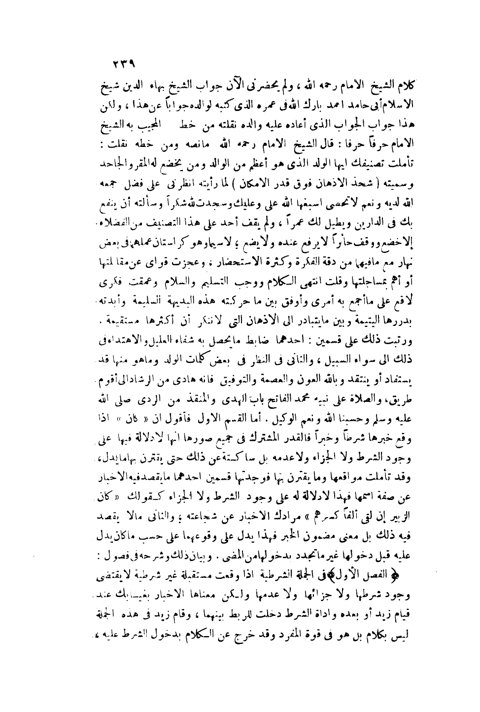 كَلَامُ الشَّيْخِ الْإِمَامِ - رَحِمَهُ اللَّهُ -، وَلَمْ يَحْضُرْنِي الْآنَ جَوَابُ الشَّيْخِ بَهَاءِ الدِّينِ شَيْخِ الْإِسْلَامِ أَبِي حَامِدٍ أَحْمَدَ بَارَكَ اللَّهُ فِي عُمُرِهِ الَّذِي كَتَبَهُ لِوَالِدِهِ جَوَابًا عَنْ هَذَا، وَلَكِنَّ هَذَا جَوَابُ الْجَوَابِ الَّذِي أَعَادَهُ عَلَيْهِ وَالِدُهُ نَقَلْتُهُ مِنْ خَطِّ الْمُجِيبِ بِهِ الشَّيْخِ الْإِمَامِ حَرْفًا حَرْفًا: قَالَ الشَّيْخُ الْإِمَامُ - رَحِمَهُ اللَّهُ - مَا نَصُّهُ وَمِنْ خَطِّهِ نَقَلْت: تَأَمَّلْت تَصْنِيفَك أَيُّهَا الْوَلَدُ الَّذِي هُوَ أَعْظَمُ مِنْ الْوَالِدِ وَمَنْ يَخْضَعُ لَهُ الْمُقِرُّ وَالْجَاحِدُ وَسَمَّيْته (شَحْذُ الْأَذْهَانِ فَوْقَ قَدْرِ الْإِمْكَانِ) لِمَا رَأَيْتُهُ أَنْظَرَنِي عَلَى فَضْلٍ جَمَعَهُ اللَّهُ لَدَيْهِ وَنِعَمٍ لَا تُحْصَى أَسْبَغَهَا اللَّهُ عَلَيَّ وَعَلَيْك وَسَجَدْت لِلَّهِ شُكْرًا وَسَأَلْتُهُ أَنْ يَنْفَعَ بِك فِي الدَّارَيْنِ وَيُطِيلَ لَك عُمُرًا، وَلَمْ يَقِفْ أَحَدٌ عَلَى هَذَا التَّصْنِيفِ مِنْ الْفُضَلَاءِ إلَّا خَضَعَ وَوَقَفَ حَائِرًا لَا يَرْفَعُ عِنْدَهُ وَلَا يَضَعُ؛ لَا سِيَّمَا وَهُوَ كُرَّاسَتَانِ عَمِلَهُمَا فِي بَعْضِ نَهَارٍ مَعَ مَا فِيهِمَا مِنْ دِقَّةِ الْفِكْرَةِ وَكَثْرَةِ الِاسْتِحْضَارِ، عَجَزَتْ قُوَايَ عَنْ مُقَابَلَتِهَا أَوْ أَهُمُّ بِمُسَاجَلَتِهَا وَقُلْت: انْتَهَى الْكَلَامُ وَوَجَبَ التَّسْلِيمُ وَالسَّلَامُ وَعَمَّقْت فِكْرِي لِأَقَعَ عَلَى مَا أَجْمَعُ بِهِ أَمْرِي وَأُوَفِّقَ بَيْنَ مَا حَرَّكَتْهُ هَذِهِ الْبَدِيهَةُ السَّلِيمَةُ وَأَبْدَتْهُ بِدُرَرِهَا الْيَتِيمَةُ وَبَيْنَ مَا يُتَبَادَرُ إلَى الْأَذْهَانِ الَّتِي لَا تُنْكِرُ أَنَّ أَكْثَرَهَا مُسْتَقِيمَةٌ.