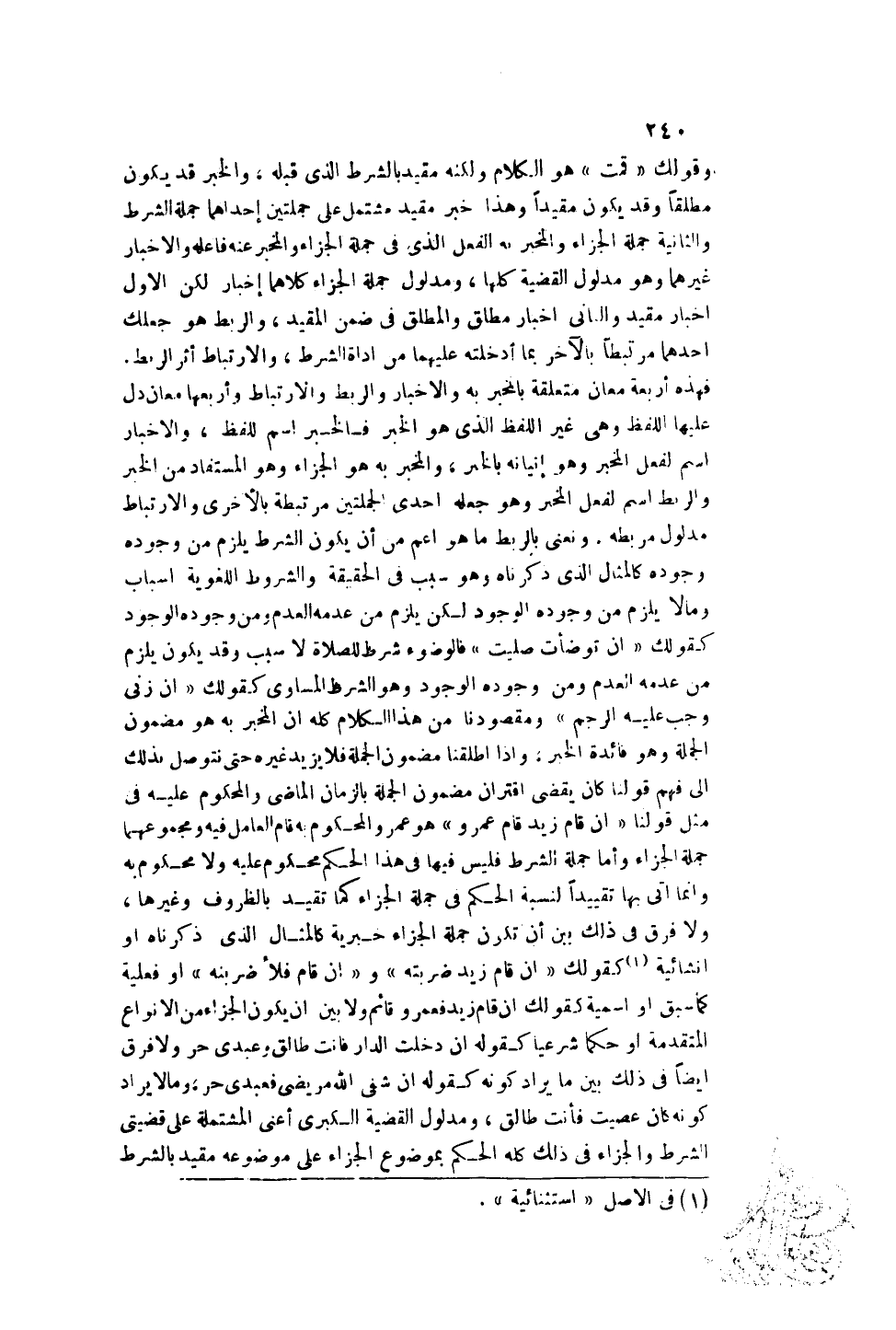 وَقَوْلُك " قُمْت " هُوَ الْكَلَامُ وَلَكِنَّهُ مُقَيَّدٌ بِالشَّرْطِ الَّذِي قَبْلَهُ، وَالْخَبَرُ قَدْ يَكُونُ مُطْلَقًا وَقَدْ يَكُونُ مُقَيَّدًا وَهَذَا خَبَرٌ مُقَيَّدٌ مُشْتَمِلٌ عَلَى جُمْلَتَيْنِ: إحْدَاهُمَا جُمْلَةُ الشَّرْطِ وَالثَّانِيَةُ جُمْلَةُ الْجَزَاءِ وَالْمُخْبَرُ بِهِ الْفِعْلُ الَّذِي فِي جُمْلَةِ الْجَزَاءِ وَالْمُخْبَرُ عَنْهُ فَاعِلُهُ وَالْإِخْبَارُ غَيْرُهُمَا وَهُوَ مَدْلُولُ الْقَضِيَّةِ كُلِّهَا، وَمَدْلُولُ جُمْلَةِ الْجَزَاءِ كِلَاهُمَا إخْبَارٌ لَكِنَّ الْأَوَّلَ إخْبَارٌ مُقَيَّدٌ وَالثَّانِي إخْبَارٌ مُطْلَقٌ وَالْمُطْلَقُ فِي ضِمْنِ الْمُقَيَّدِ، وَالرَّبْطُ هُوَ جَعْلُك أَحَدَهُمَا مُرْتَبِطًا بِالْآخَرِ بِمَا أَدْخَلْتَهُ عَلَيْهِمَا مِنْ أَدَاةِ الشَّرْطِ، وَالِارْتِبَاطُ أَثَرُ الرَّبْطِ.