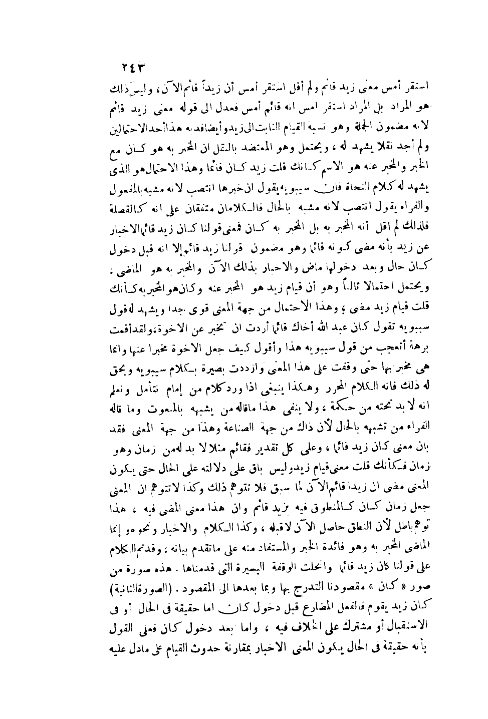 فَإِنَّ سِيبَوَيْهِ يَقُولُ: إنَّ خَبَرَهَا انْتَصَبَ لِأَنَّهُ مُشَبَّهٌ بِالْمَفْعُولِ وَالْفَرَّاءُ يَقُولُ: انْتَصَبَ لِأَنَّهُ مُشَبَّهٌ بِالْحَالِ فَالْكَلَامَانِ مُتَّفِقَانِ عَلَى أَنَّهُ كَالْقِصْلَةِ فَلِذَلِكَ لَمْ أَقُلْ إنَّهُ الْمُخْبَرُ بِهِ بَلْ الْمُخْبَرُ بِهِ كَانَ فَمَعْنَى قَوْلِنَا كَانَ زَيْدٌ قَائِمًا الْإِخْبَارُ عَنْ زَيْدٍ بِأَنَّهُ مَضَى كَوْنُهُ قَائِمًا وَهُوَ مَضْمُونُ قَوْلِنَا زَيْدٌ قَائِمٌ إلَّا أَنَّهُ قَبْلَ دُخُولِ كَانَ حَالٌ وَبَعْدَ دُخُولِهَا مَاضٍ وَالْإِخْبَارُ بِذَلِكَ الْآنَ وَالْمُخْبَرُ بِهِ هُوَ الْمَاضِي، وَيَحْتَمِلُ احْتِمَالًا ثَالِثًا وَهُوَ أَنَّ قِيَامَ زَيْدٍ هُوَ الْمُخْبَرُ عَنْهُ وَكَانَ هُوَ الْمُخْبَرُ بِهِ كَأَنَّك قُلْت: قِيَامُ زَيْدٍ مَضَى؛ وَهَذَا الِاحْتِمَالُ مِنْ جِهَةِ الْمَعْنَى قَوِيٌّ جِدًّا وَيَشْهَدُ لَهُ قَوْلُ سِيبَوَيْهِ تَقُولُ: كَانَ عَبْدُ اللَّهِ أَخَاك قَائِمًا أَرَدْت أَنْ تُخْبِرَ عَنْ الْأُخُوَّةِ وَلَقَدْ أَقَمْتُ بُرْهَةً أَتَعَجَّبُ مِنْ قَوْلِ سِيبَوَيْهِ هَذَا وَأَقُولُ كَيْفَ جَعَلَ الْأُخُوَّةَ مُخْبَرًا عَنْهَا وَإِنَّمَا هِيَ مُخْبَرٌ بِهَا حَتَّى وَقَفْت عَلَى هَذَا الْمَعْنَى وَازْدَدْت بَصِيرَةً بِكَلَامِ سِيبَوَيْهِ وَيَحِقُّ لَهُ ذَلِكَ فَإِنَّهُ الْكَلَامُ الْمُحَرَّرُ وَهَكَذَا يَنْبَغِي إذَا وَرَدَ كَلَامٌ مِنْ إمَامٍ نَتَأَمَّلُ وَنَعْلَمُ أَنَّهُ لَا بُدَّ تَحْتَهُ مِنْ حِكْمَةٍ، وَلَا يَنْفِي هَذَا مَا قَالَهُ مَنْ يُشَبِّهُهُ بِالْمَنْعُوتِ وَمَا قَالَهُ الْفَرَّاءُ مِنْ تَشَبُّهِهِ بِالْحَالِ لِأَنَّ ذَاكَ مِنْ جِهَةِ الصِّنَاعَةِ وَهَذَا مِنْ جِهَةِ الْمَعْنَى فَقَدْ بَانَ مَعْنَى كَانَ زَيْدٌ قَائِمًا، وَعَلَى كُلِّ تَقْدِيرٍ فَقَائِمٌ مَثَلًا لَا بُدَّ لَهُ مِنْ زَمَانٍ وَهُوَ زَمَانٌ فَكَأَنَّك قُلْت مَعْنًى قِيَامُ زَيْدٍ وَلَيْسَ بَاقٍ عَلَى دَلَالَتِهِ عَلَى الْحَالِ حَتَّى يَكُونَ الْمَعْنَى مَضَى أَنَّ زَيْدًا قَائِمٌ الْآنَ لِمَا سَبَقَ فَلَا تَتَوَهَّمُ ذَلِكَ وَكَذَا لَا تَتَوَهَّمُ أَنَّ الْمَعْنَى جَعَلَ زَمَان كَانَ كَالْمَنْطُوقِ فِيهِ بِزَيْدٍ قَائِمٍ وَأَنَّ هَذَا مَعْنَى الْمُضِيِّ فِيهِ.