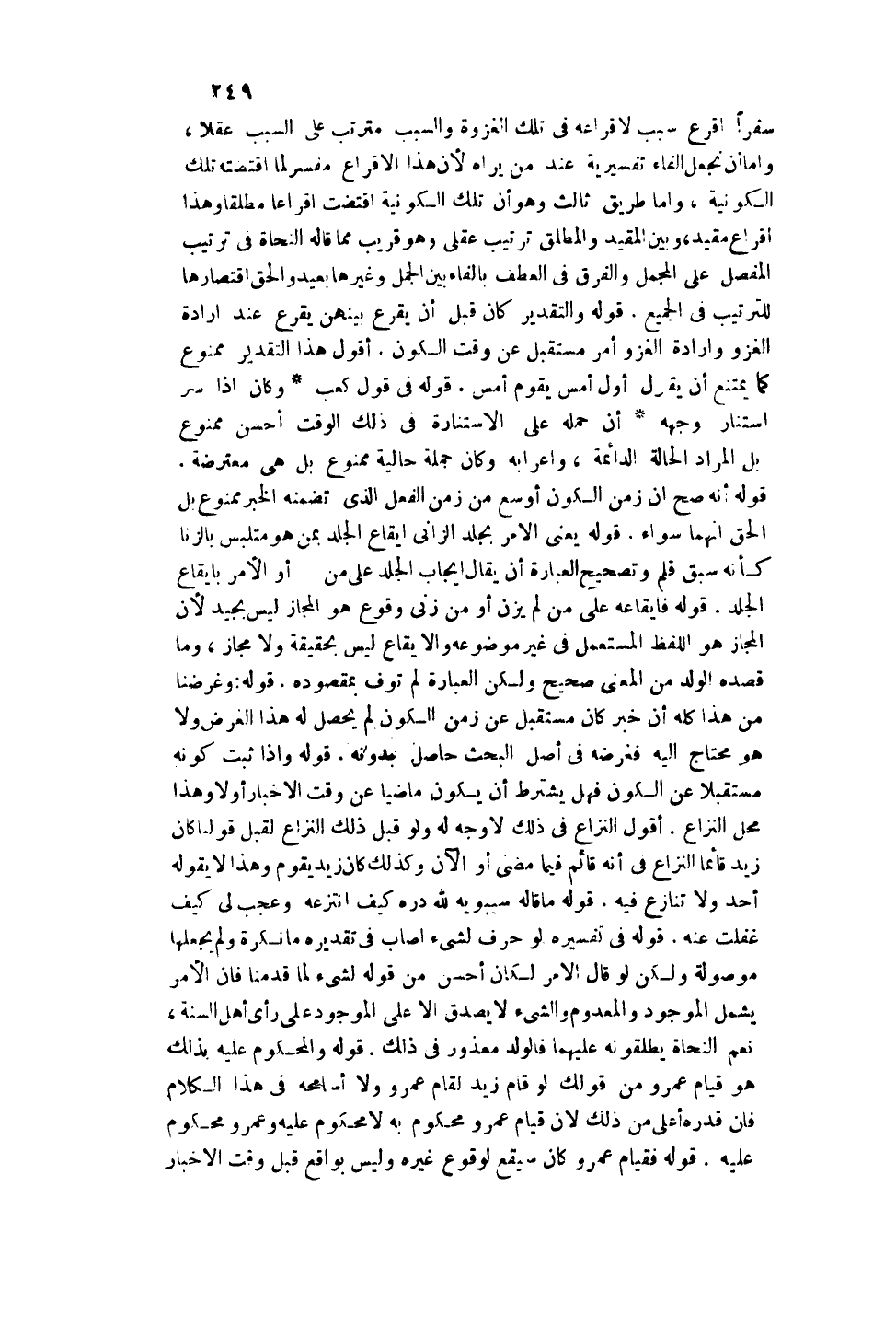 أَقُولُ النِّزَاعُ فِي ذَلِكَ لَا وَجْهَ لَهُ وَلَوْ قُبِلَ ذَلِكَ النِّزَاعُ لَقُبِلَ قَوْلُنَا كَانَ زَيْدٌ قَائِمًا النِّزَاعُ فِي أَنَّهُ قَائِمٌ فِيمَا مَضَى أَوْ الْآنَ وَكَذَلِكَ كَانَ زَيْدٌ يَقُومُ وَهَذَا لَا يَقُولُهُ أَحَدٌ وَلَا تَنَازُعَ فِيهِ. قَوْلُهُ مَا قَالَهُ سِيبَوَيْهِ لِلَّهِ دَرَّهُ كَيْفَ انْتَزَعَهُ وَعَجِبَ لِي كَيْفَ غَفَلْت عَنْهُ. قَوْلُهُ فِي تَفْسِيرِهِ لَوْ حَرْفٌ لِشَيْءٍ أَصَابَ فِي تَقْدِيرِهِ مَا نَكِرَةٌ وَلَمْ يَجْعَلْهَا مَوْصُولَةً وَلَكِنْ لَوْ قَالَ الْأَمْرُ لَكَانَ أَحْسَنَ مِنْ قَوْلِهِ لِشَيْءٍ لِمَا قَدَّمْنَا فَإِنَّ الْأَمْرَ يَشْمَلُ الْوُجُودَ وَالْمَعْدُومَ وَالشَّيْءُ لَا يُصَدَّقُ إلَّا عَلَى الْمَوْجُودِ عَلَى رَأْيِ أَهْلِ السُّنَّةِ، نَعَمْ النُّحَاةُ يُطْلِقُونَهُ عَلَيْهِمَا فَالْوَلَدُ مَعْذُورٌ فِي ذَلِكَ.