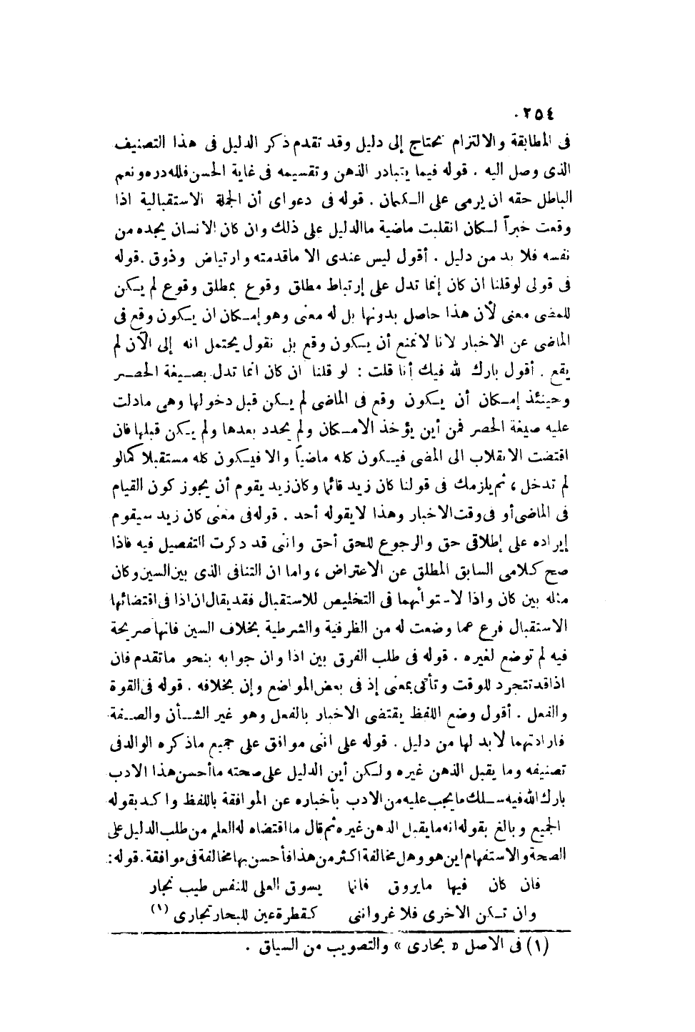 فِي الْمُطَابَقَةِ وَالِالْتِزَامِ تَحْتَاجُ إلَى دَلِيلٍ وَقَدْ تَقَدَّمَ ذِكْرُ الدَّلِيلِ فِي هَذَا التَّصْنِيفِ الَّذِي وَصَلَ إلَيْهِ. قَوْلُهُ فِيمَا يَتَبَادَرُ الذِّهْنَ وَتَقْسِيمُهُ فِي غَايَةِ الْحُسْنِ فَلِلَّهِ دَرَّهُ وَنِعْمَ الْبَاطِلُ حَقُّهُ أَنْ يُرْمَى عَلَى الْكِتْمَانِ. قَوْلُهُ فِي دَعْوَايَ أَنَّ الْجُمْلَةَ الِاسْتِقْبَالِيَّة إذَا وَقَعَتْ خَبَرًا لَكَانَ انْقَلَبَتْ مَاضِيَةً مَا الدَّلِيلُ عَلَى ذَلِكَ؟ وَإِنْ كَانَ الْإِنْسَانُ يَجِدُهُ مِنْ نَفْسِهِ فَلَا بُدَّ مِنْ دَلِيلٍ.؟ أَقُولُ: لَيْسَ عِنْدِي إلَّا مَا قَدَّمْتُهُ وَارْتِيَاضٌ وَذَوْقٌ. قَوْلُهُ فِي قَوْلِي لَوْ قُلْنَا: إنْ كَانَ إنَّمَا تَدُلُّ عَلَى ارْتِبَاطِ مُطْلَقِ وُقُوعٍ بِمُطْلَقِ وُقُوعٍ لَمْ يَكُنْ لِلْمُضِيِّ مَعْنًى لِأَنَّ هَذَا حَاصِلٌ بِدُونِهَا بَلْ لَهُ مَعْنًى وَهُوَ إمْكَانُ أَنْ يَكُونَ وَقَعَ فِي الْمَاضِي عَنْ الْإِخْبَارِ لِأَنَّا لَا نَمْنَعُ أَنْ يَكُونَ وَقَعَ بَلْ نَقُولُ: يُحْتَمَلُ أَنَّهُ إلَى الْآنَ لَمْ يَقَعْ. أَقُولُ: بَارَكَ اللَّهُ فِيك أَنَا قُلْت: لَوْ قُلْنَا: إنْ كَانَ إنَّمَا تَدُلُّ بِصِيغَةِ الْحَصْرِ وَحِينَئِذٍ إمْكَانُ أَنْ يَكُونَ وَقَعَ فِي الْمَاضِي لَمْ يَكُنْ قَبْلَ دُخُولِهَا وَهِيَ مَا دَلَّتْ عَلَيْهِ صِيغَةُ الْحَصْرِ فَمِنْ أَيْنَ يُؤْخَذُ الْإِمْكَانُ وَلَمْ يُحَدَّدْ بَعْدَهَا وَلَمْ يَكُنْ قَبْلَهَا فَإِنْ اقْتَضَتْ الِانْقِلَابَ إلَى الْمُضِيِّ فَيَكُونُ كُلُّهُ مَاضِيًا وَإِلَّا فَيَكُونُ كُلُّهُ مُسْتَقْبَلًا كَمَا لَوْ لَمْ تَدْخُلْ، ثُمَّ يَلْزَمُك فِي قَوْلِنَا كَانَ زَيْدٌ قَائِمًا وَكَانَ زَيْدٌ يَقُومُ أَنْ يَجُوزَ كَوْنُ الْقِيَامِ فِي الْمَاضِي أَوْ فِي وَقْتِ الْإِخْبَارِ وَهَذَا لَا يَقُولُهُ أَحَدٌ.