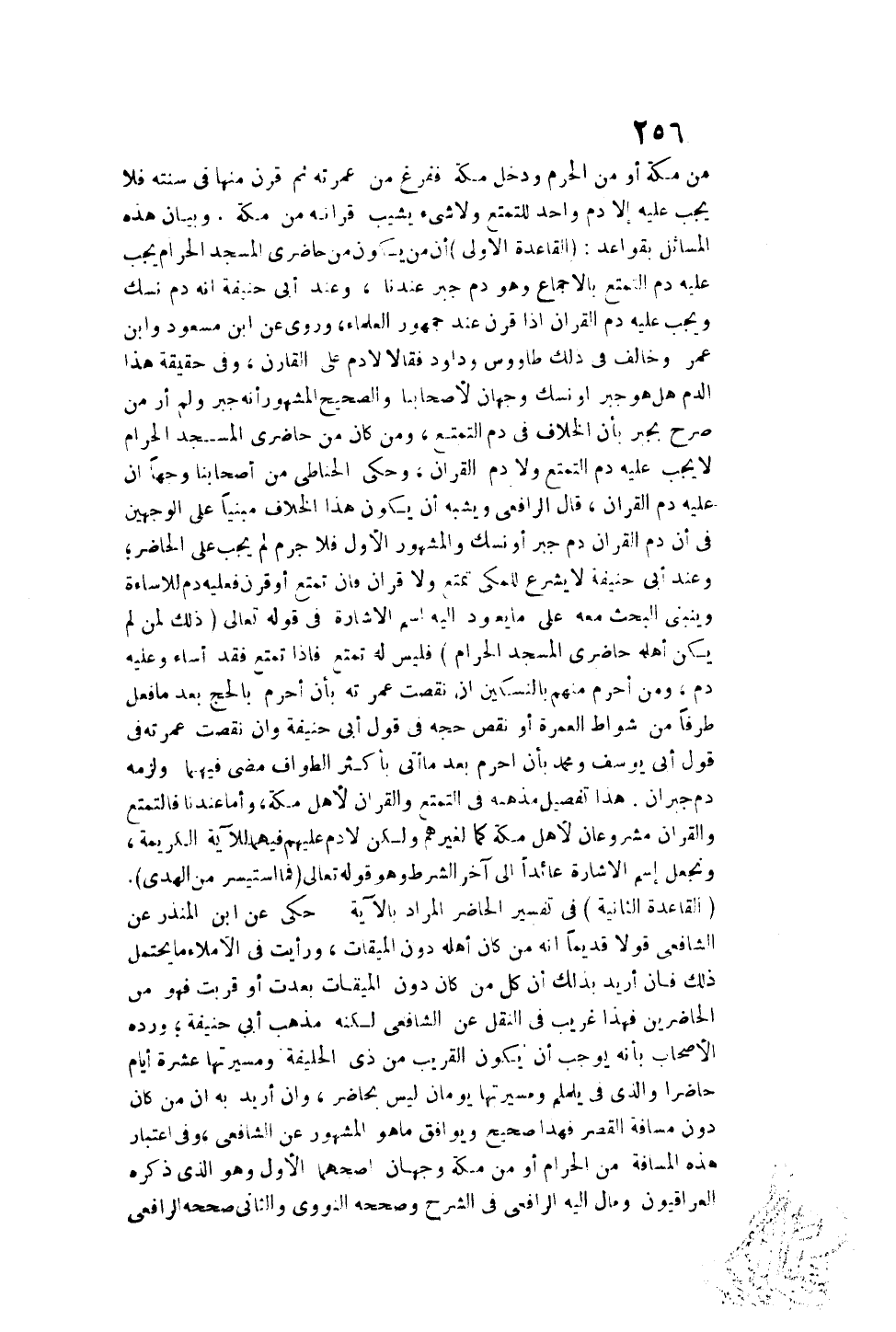 (الْقَاعِدَةُ الثَّانِيَةُ) فِي تَفْسِيرِ الْحَاضِرِ الْمُرَادِ بِالْآيَةِ حُكِيَ عَنْ ابْنِ الْمُنْذِرِ عَنْ الشَّافِعِيِّ قَوْلًا قَدِيمًا إنَّهُ مَنْ كَانَ أَهْلُهُ دُونَ الْمِيقَاتِ، وَرَأَيْت فِي الْإِمْلَاءِ مَا يَحْتَمِلُ ذَلِكَ فَإِنْ أُرِيدَ بِذَلِكَ أَنَّ كُلَّ مَنْ كَانَ دُونَ الْمِيقَاتِ بَعُدَتْ أَوْ قَرُبَتْ فَهُوَ مِنْ الْحَاضِرِينَ فَهَذَا غَرِيبٌ فِي النَّقْلِ عَنْ الشَّافِعِيِّ لَكِنَّهُ مَذْهَبُ أَبِي حَنِيفَةَ؛ وَرَدَّهُ الْأَصْحَابُ بِأَنَّهُ يُوجِبُ أَنْ يَكُونَ الْقَرِيبَ مِنْ ذِي الْحُلَيْفَةِ وَمَسِيرَتُهَا عَشْرَةُ أَيَّامٍ حَاضِرًا وَاَلَّذِي فِي يَلَمْلَمَ وَمَسِيرَتُهَا يَوْمَانِ لَيْسَ بِحَاضِرٍ، وَإِنْ أُرِيدَ بِهِ أَنَّ مَنْ كَانَ دُونَ مَسَافَةِ الْقَصْرِ فَهَذَا صَحِيحٌ وَيُوَافِقُ مَا هُوَ الْمَشْهُورُ عَنْ الشَّافِعِيِّ، وَفِي اعْتِبَارِ هَذِهِ الْمَسَافَةِ مِنْ الْحَرَمِ أَوْ مِنْ مَكَّةَ وَجْهَانِ: أَصَحُّهُمَا الْأَوَّلُ وَهُوَ الَّذِي ذَكَرَهُ الْعِرَاقِيُّونَ وَمَالَ إلَيْهِ الرَّافِعِيُّ فِي الشَّرْحِ وَصَحَّحَهُ النَّوَوِيُّ وَالثَّانِي صَحَّحَهُ الرَّافِعِيُّ