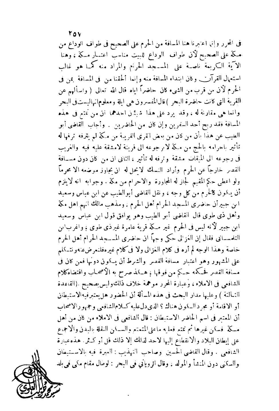 فِي الْمُحَرَّرِ وَإِنَّمَا اعْتَبَرْنَا هُنَا الْمَسَافَةَ مِنْ الْحَرَمِ عَلَى الصَّحِيحِ فِي طَوَافِ الْوَدَاعِ مِنْ مَكَّةَ عَلَى الصَّحِيحِ لِأَنَّ طَوَافَ الْوَدَاعِ لِلْبَيْتِ مُنَاسِبٌ اعْتِبَارَ مَكَّةَ، وَهُنَا الْآيَةُ الْكَرِيمَةُ نَاصَّةٌ عَلَى الْمَسْجِدِ الْحَرَامِ وَالْمُرَادُ مِنْهُ كَمَا هُوَ غَالِبُ اسْتِعْمَالِ الْقُرْآنِ وَكَانَ ابْتِدَاءُ الْمَسَافَةِ مِنْهُ وَإِنَّمَا أَلْحَقْنَا مَنْ فِي الْمَسَافَةِ بِمَنْ فِي الْحَرَمِ لِأَنَّ مَنْ قَرُبَ مِنْ الشَّيْءِ كَانَ حَاضِرًا إيَّاهُ قَالَ اللَّهُ تَعَالَى {وَاسْأَلْهُمْ عَنِ الْقَرْيَةِ الَّتِي كَانَتْ حَاضِرَةَ الْبَحْرِ} [الأعراف: 163] قَالَ الْمُفَسِّرُونَ: هِيَ أَيْلَةُ وَمَعْلُومٌ أَنَّهَا لَيْسَتْ فِي الْبَحْرِ وَإِنَّمَا هِيَ مُقَارِنَةٌ لَهُ.