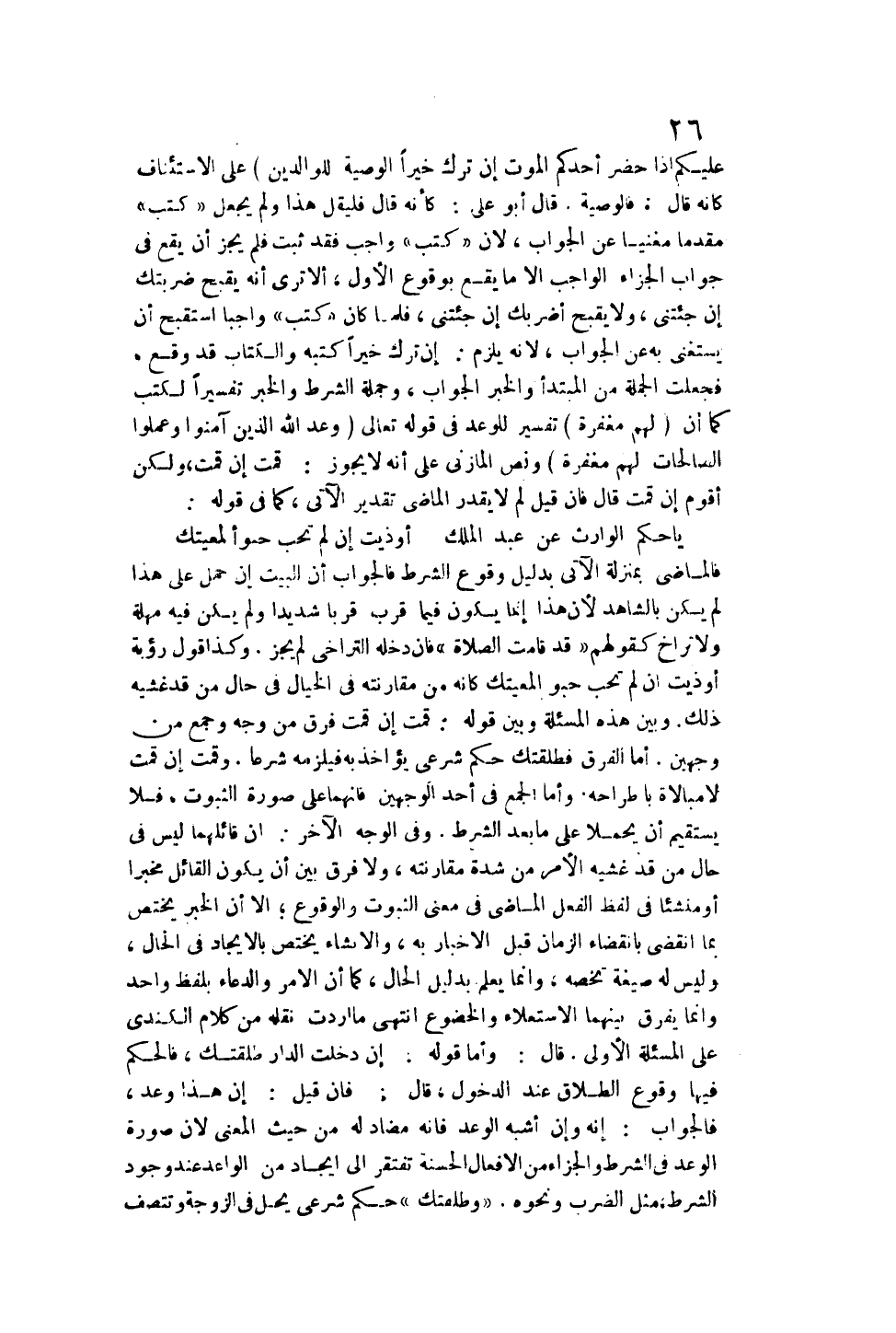 قَالَ أَبُو عَلِيٍّ: كَأَنَّهُ قَالَ فَلْيَقُلْ هَذَا وَلَمْ يَجْعَلْ " كُتِبَ " مُقَدَّمًا مُغْنِيًا عَنْ الْجَوَابِ، لِأَنَّ " كُتِبَ " وَاجِبٌ فَقَدْ ثَبَتَ فَلَمْ يَجُزْ أَنْ يَقَعَ فِي جَوَابِ الْجَزَاءِ الْوَاجِبِ إلَّا مَا يَقَعُ بِوُقُوعِ الْأَوَّلِ، أَلَا تَرَى أَنَّهُ يَقْبُحُ ضَرَبْتُك إنْ جِئْتنِي، وَلَا يَقْبُحُ أَضْرِبُك إنْ جِئْتنِي، فَلَمَّا كَانَ " كُتِبَ " وَاجِبًا اُسْتُقْبِحَ أَنْ يُسْتَغْنَى بِهِ عَنْ الْجَوَابِ، لِأَنَّهُ يَلْزَمُ: إنْ تَرَكَ خَيْرًا كَتَبَهُ وَالْكِتَابُ قَدْ وَقَعَ، فَجَعَلْت الْجُمْلَةَ مِنْ الْمُبْتَدَأِ وَالْخَبَرِ الْجَوَابَ، وَجُمْلَةُ الشَّرْطِ وَالْخَبَرِ تَفْسِيرًا لِكُتِبَ كَمَا أَنَّ {لَهُمْ مَغْفِرَةٌ} [المائدة: 9] تَفْسِيرٌ لِلْوَعْدِ فِي قَوْله تَعَالَى {وَعَدَ اللَّهُ الَّذِينَ آمَنُوا وَعَمِلُوا الصَّالِحَاتِ لَهُمْ مَغْفِرَةٌ} [المائدة: 9] وَنَصَّ الْمَازِنِيُّ عَلَى أَنَّهُ لَا يَجُوزُ: قُمْتُ إنْ قُمْتَ، وَلَكِنْ أَقُومُ إنْ قُمْتَ قَالَ فَإِنْ قِيلَ لِمَ لَا يُقَدَّرُ الْمَاضِي تَقْدِيرَ الْآتِي، كَمَا فِي قَوْلِهِ: