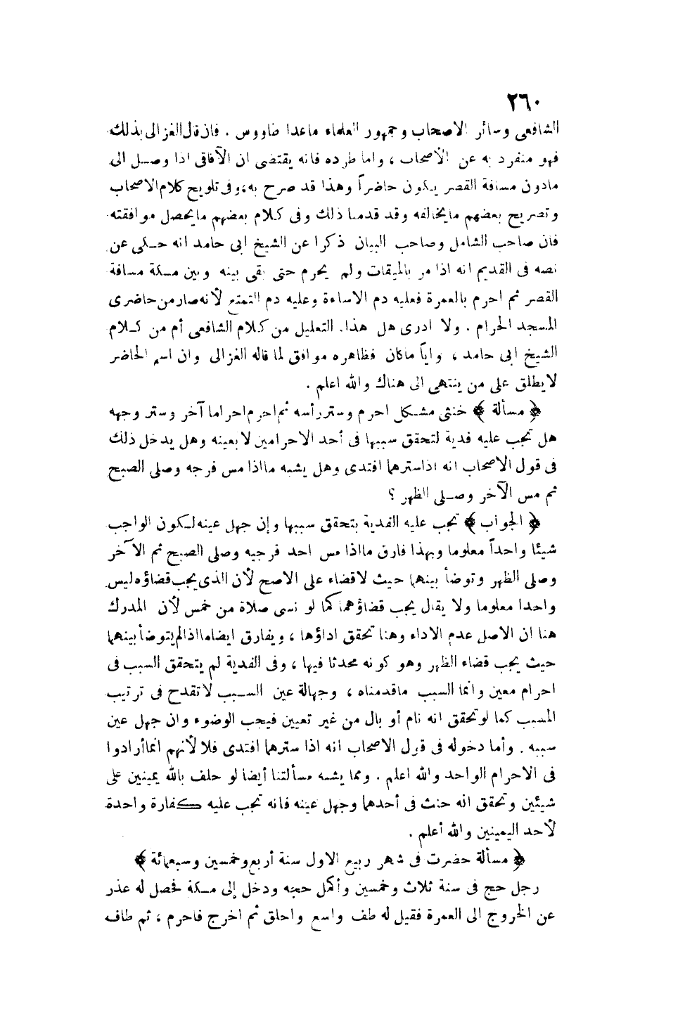 (الْجَوَابُ) تَجِبُ عَلَيْهِ الْفِدْيَةُ بِتَحَقُّقِ سَبَبِهَا وَإِنْ جَهِلَ عَيْنَهُ لِكَوْنِ الْوَاجِبِ شَيْئًا وَاحِدًا مَعْلُومًا وَبِهَذَا فَارَقَ مَا إذَا مَسَّ أَحَدَ فَرْجَيْهِ وَصَلَّى الصُّبْحَ ثُمَّ الْآخَرَ وَصَلَّى الظُّهْرَ وَتَوَضَّأَ بَيْنَهُمَا حَيْثُ لَا قَضَاءَ عَلَى الْأَصَحِّ لِأَنَّ الَّذِي يَجِبُ قَضَاؤُهُ لَيْسَ وَاحِدًا مَعْلُومًا وَلَا يُقَالُ يَجِبُ قَضَاؤُهُمَا كَمَا لَوْ نَسِيَ صَلَاةً مِنْ خَمْسٍ لِأَنَّ الْمُدْرَكَ هُنَا أَنَّ الْأَصْلَ عَدَمُ الْأَدَاءِ وَهُنَا تَحَقَّقَ أَدَاؤُهَا، وَيُفَارِقُ أَيْضًا مَا إذَا لَمْ يَتَوَضَّأْ بَيْنَهُمَا حَيْثُ يَجِبُ قَضَاءُ الظُّهْرِ وَهُوَ كَوْنُهُ مُحْدِثًا فِيهَا، وَفِي الْفِدْيَةِ لَمْ يَتَحَقَّقْ السَّبَبُ فِي إحْرَامٍ مُعَيَّنٍ وَإِنَّمَا السَّبَبُ مَا قَدَّمْنَاهُ، وَجَهَالَةُ عَيْنِ السَّبَبِ لَا تَقْدَحُ فِي تَرْتِيبِ الْمُسَبِّبِ كَمَا لَوْ تَحَقَّقَ أَنَّهُ نَامَ أَوْ بَالَ مِنْ غَيْرِ تَعْيِينٍ فَيَجِبُ الْوُضُوءُ وَإِنْ جَهِلَ عَيْنَ سَبَبِهِ.