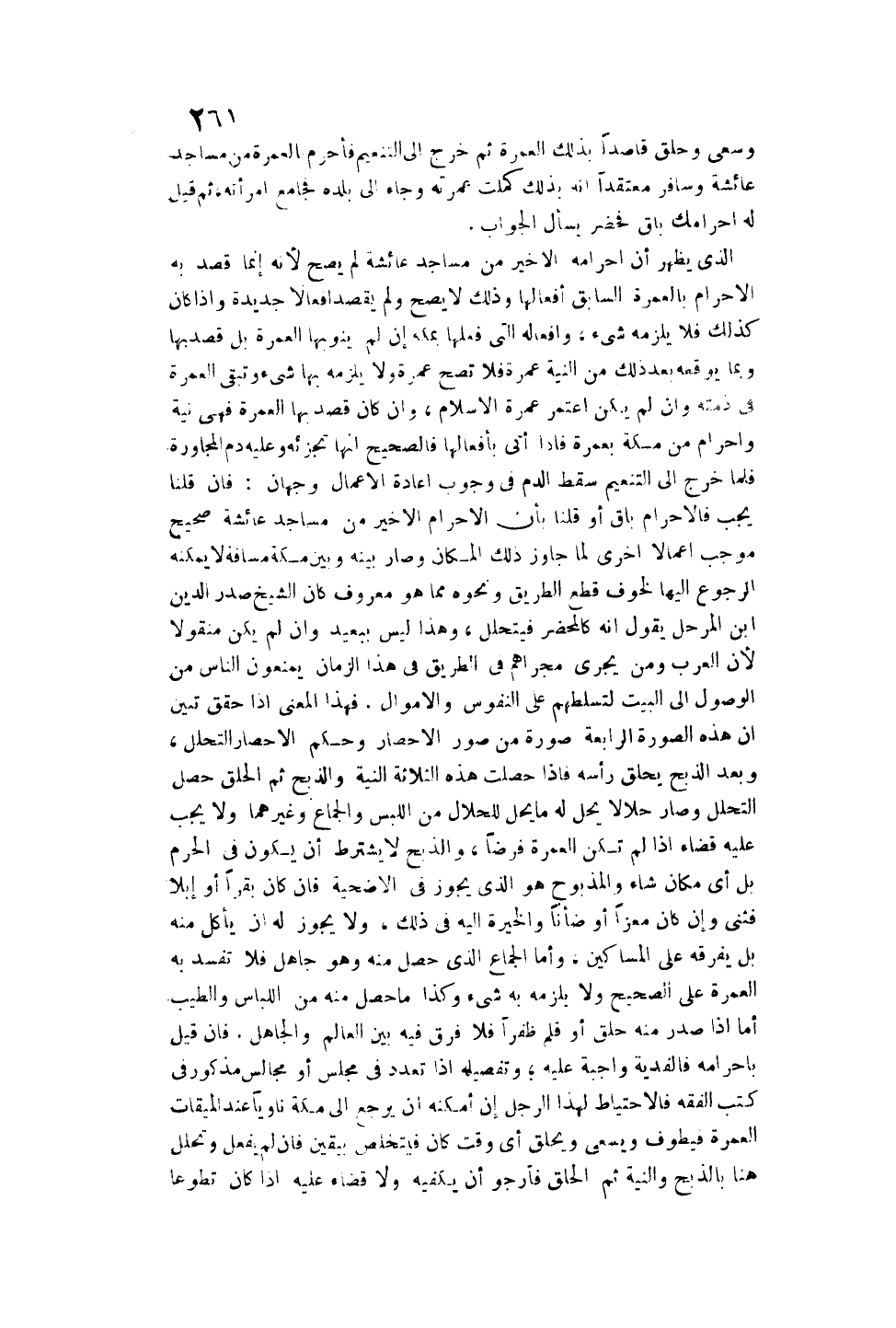 وَسَعَى وَحَلَقَ قَاصِدًا بِذَلِكَ الْعُمْرَةَ ثُمَّ خَرَجَ إلَى التَّنْعِيمِ فَأَحْرَمَ الْعُمْرَةَ مِنْ مَسَاجِدِ عَائِشَةَ وَسَافَرَ مُعْتَقِدًا أَنَّهُ بِذَلِكَ كَمُلَتْ عُمْرَتُهُ وَجَاءَ إلَى بَلَدِهِ فَجَامَعَ امْرَأَتَهُ، ثُمَّ قِيلَ لَهُ: إحْرَامُك بَاقٍ فَحَضَرَ يَسْأَلُ الْجَوَابَ الَّذِي يَظْهَرُ أَنَّ إحْرَامَهُ الْأَخِيرَ مِنْ مَسَاجِدِ عَائِشَةَ لَمْ يَصِحَّ لِأَنَّهُ إنَّمَا قَصَدَ بِهِ الْإِحْرَامَ بِالْعُمْرَةِ السَّابِقِ أَفْعَالُهَا وَذَلِكَ لَا يَصِحُّ وَلَمْ يَقْصِدْ أَفْعَالًا جَدِيدَةً وَإِذَا كَانَ كَذَلِكَ فَلَا يَلْزَمُهُ شَيْءٌ، وَأَفْعَالُهُ الَّتِي فَعَلَهَا بِمَكَّةَ إنْ لَمْ يَنْوِ بِهَا الْعُمْرَةَ بَلْ قَصَدَ بِهَا وَبِمَا يُوقِعُهُ بَعْدَ ذَلِكَ مِنْ النِّيَّةِ عُمْرَةً فَلَا تَصِحُّ عُمْرَةً وَلَا يَلْزَمُهُ بِهَا شَيْءٌ وَتَبْقَى الْعُمْرَةُ فِي ذِمَّتِهِ وَإِنْ لَمْ يَكُنْ اعْتَمَرَ عُمْرَةَ الْإِسْلَامِ، وَإِنْ كَانَ قَصَدَ بِهَا الْعُمْرَةَ فَهِيَ نِيَّةٌ وَإِحْرَامٌ مِنْ مَكَّةَ بِعُمْرَةٍ فَإِذَا أَتَى بِأَفْعَالِهَا فَالصَّحِيحُ أَنَّهَا تُجْزِئُهُ وَعَلَيْهِ دَمُ الْمُجَاوِرَةِ فَلَمَّا خَرَجَ إلَى التَّنْعِيمِ سَقَطَ الدَّمُ فِي وُجُوبِ إعَادَةِ الْأَعْمَالِ وَجْهَانِ: فَإِنْ قُلْنَا يَجِبُ فَالْإِحْرَامُ بَاقٍ أَوْ قُلْنَا بِأَنَّ الْإِحْرَامَ الْأَخِيرَ مِنْ مَسَاجِدِ عَائِشَةَ صَحِيحٌ مُوجِبٌ أَعْمَالًا أُخْرَى لَمَّا جَاوَزَ ذَلِكَ الْمَكَانَ وَصَارَ بَيْنَهُ وَبَيْنَ مَكَّةَ مَسَافَةٌ لَا يُمْكِنُهُ الرُّجُوعُ إلَيْهَا لِخَوْفِ قَطْعِ الطَّرِيقِ وَنَحْوِهِ مِمَّا هُوَ مَعْرُوفٌ كَانَ الشَّيْخُ صَدْرُ الدِّينِ بْنِ الْمُرَحَّلِ يَقُولُ: إنَّهُ كَالْمُحْصِرِ فَيَتَحَلَّلُ، وَهَذَا لَيْسَ بِبَعِيدٍ وَإِنْ لَمْ يَكُنْ مَنْقُولًا لِأَنَّ الْعَرَبَ وَمَنْ يَجْرِي مَجْرَاهُمْ فِي الطَّرِيقِ فِي هَذَا الزَّمَانِ يَمْنَعُونَ النَّاسَ مِنْ الْوُصُولِ إلَى الْبَيْتِ لِتَسَلُّطِهِمْ عَلَى النُّفُوسِ وَالْأَمْوَالِ.