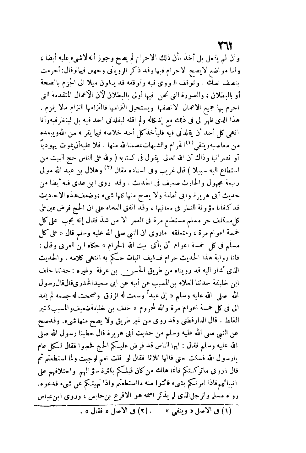 وَضَعْفُ هَذِهِ الْأَحَادِيثِ قَدْ كَفَانَا مَئُونَةَ النَّظَرِ فِي مَعَانِيهَا، وَقَدْ اتَّفَقَ الْعُلَمَاءُ عَلَى أَنَّ الْحَجَّ فَرْضُ عَيْنٍ عَلَى كُلِّ مُكَلَّفٍ حُرٍّ مُسْلِمٍ مُسْتَطِيعٍ مَرَّةً فِي الْعُمُرِ إلَّا مَنْ شَذَّ فَقَالَ: إنَّهُ يَجِبُ عَلَى كُلِّ خَمْسَةِ أَعْوَامٍ مَرَّةً، وَمُتَعَلَّقُهُ مَا رُوِيَ أَنَّ النَّبِيَّ - صَلَّى اللَّهُ عَلَيْهِ وَسَلَّمَ - قَالَ «عَلَى كُلِّ مُسْلِمٍ فِي كُلِّ خَمْسَةِ أَعْوَامٍ أَنْ يَأْتِيَ بَيْتَ اللَّهِ الْحَرَامَ» حَكَاهُ ابْنُ الْعَرَبِيِّ وَقَالَ: قُلْنَا رِوَايَةُ هَذَا الْحَدِيثِ حَرَامٌ فَكَيْفَ إثْبَاتُ حُكْمٍ بِهِ انْتَهَى كَلَامُهُ. وَالْحَدِيثُ الَّذِي أَشَارَ إلَيْهِ قَدْ رَوَيْنَاهُ مِنْ طَرِيقِ الْحَسَنِ بْنِ عَرَفَةَ وَغَيْرِهِ: حَدَّثَنَا خَلَفُ بْنُ خَلِيفَةَ حَدَّثَنَا الْعَلَاءُ بْنُ الْمُسَيِّبِ عَنْ أَبِيهِ عَنْ أَبِي سَعِيدٍ الْخُدْرِيِّ قَالَ: قَالَ رَسُولُ اللَّهِ - صَلَّى اللَّهُ عَلَيْهِ وَسَلَّمَ - «إنَّ عَبْدًا وَسَّعْت لَهُ الرِّزْقَ وَصَحَحْت لَهُ جِسْمَهُ لَمْ يَفْدِ إلَيَّ فِي كُلِّ خَمْسَةِ أَعْوَامٍ مَرَّةً وَاَللَّهِ لَمَحْرُومٌ» خَلَفُ بْنُ خَلِيفَةَ ضَعِيفٌ وَالْمُسَيِّبُ كَثِيرُ الْغَلَطِ.