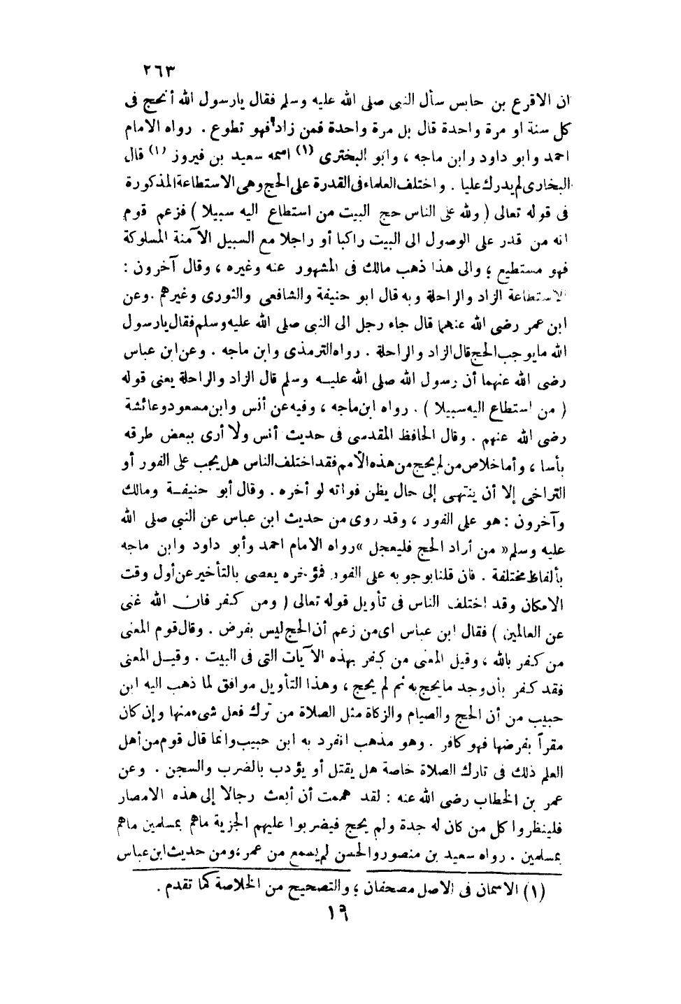 «أَنَّ الْأَقْرَعَ بْنَ حَابِسٍ سَأَلَ النَّبِيَّ - صَلَّى اللَّهُ عَلَيْهِ وَسَلَّمَ - فَقَالَ يَا رَسُولَ اللَّهِ أَنَحُجُّ فِي كُلِّ سَنَةٍ أَوْ مَرَّةً وَاحِدَةً قَالَ: بَلْ مَرَّةً وَاحِدَةً فَمَنْ زَادَ فَهُوَ تَطَوُّعٌ» . رَوَاهُ الْإِمَامُ أَحْمَدُ وَأَبُو دَاوُد وَابْنُ مَاجَهْ وَأَبُو الْبَخْتَرِيِّ اسْمُهُ سَعِيدُ بْنُ فَيْرُوزَ قَالَ الْبُخَارِيُّ: لَمْ يُدْرِكْ عَلِيًّا.