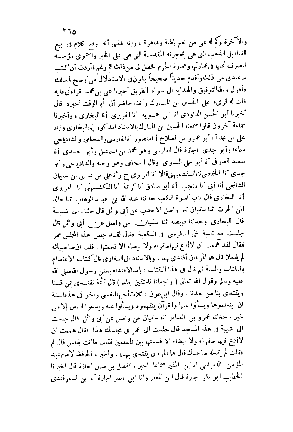وَقَالَ السُّحَامِيُّ وَهُوَ وَجِيهٌ وَالشَّادْيَاخِيُّ وَأَبُو جُدَيٍّ أَنَا الْحَفْصِيُّ ثنا الْكُشْمِيهَنِيُّ قَالَا أَنَا الْفَرَبْرِيُّ ح وَأَنَا عَلِيُّ بْنُ عِيسَى بْنُ سُلَيْمَانَ الشَّافِعِيُّ أَنَا أَبِي أَنَا مُنْجِبٌ أَنَا أَبُو صَادِقٍ أَنَا كَرِيمَةُ أَنَا الْكُشْمِيهَنِيُّ أَنَا الْفَرَبْرِيُّ أَنَا الْبُخَارِيُّ قَالَ بَابُ كُسْوَةِ الْكَعْبَةِ حَدَّثَنَا عَبْدُ اللَّهِ بْنُ عَبْدِ الْوَهَّابِ ثنا خَالِدُ بْنُ الْحَارِثِ ثنا سُفْيَانُ ثنا وَاصِلٌ الْأَحْدَبُ عَنْ أَبِي وَائِلٍ قَالَ: جِئْت إلَى شَيْبَةَ قَالَ الْبُخَارِيُّ وَحَدَّثَنَا قَبِيصَةُ ثنا سُفْيَانُ عَنْ وَاصِلٍ عَنْ أَبِي وَائِلٍ قَالَ: جَلَسْت مَعَ شَيْبَةَ عَلَى الْكُرْسِيِّ فِي الْكَعْبَةِ فَقَالَ: لَقَدْ جَلَسَ هَذَا الْمَجْلِسَ عُمَرُ فَقَالَ: لَقَدْ هَمَمْت أَنْ لَا أَدَعَ فِيهَا صَفْرَاءَ وَلَا بَيْضَاءَ إلَّا قَسَمْتُهَا. قُلْت: إنَّ صَاحِبَيْك لَمْ يَفْعَلَا قَالَ: هُمَا الْمَرْءَانِ أَقْتَدِي بِهِمَا. وَبِالْإِسْنَادِ إلَى الْبُخَارِيِّ قَالَ كِتَابُ الِاعْتِصَامِ بِالْكِتَابِ وَالسُّنَّةِ ثُمَّ قَالَ فِي هَذَا الْكِتَابِ: بَابُ الِاقْتِدَاءِ بِسُنَنِ رَسُولِ اللَّهِ - صَلَّى اللَّهُ عَلَيْهِ وَسَلَّمَ - وَقَوْلُ اللَّهِ تَعَالَى {وَاجْعَلْنَا لِلْمُتَّقِينَ إِمَامًا} [الفرقان: 74] قَالَ أَئِمَّةٌ نَقْتَدِي بِمَنْ قَبْلَنَا وَيَقْتَدِي بِنَا مَنْ بَعْدَنَا.