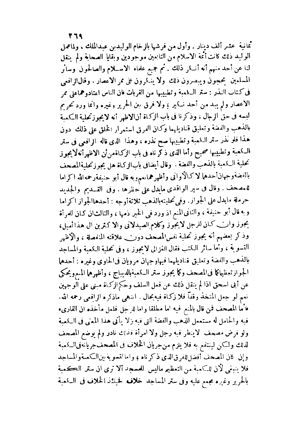 وَفِي تَحْلِيَتِهِ بِالذَّهَبِ ثَلَاثَةُ أَوْجُهٍ: أَحَدُهَا الْجَوَازُ إكْرَامًا وَبِهِ قَالَ أَبُو حَنِيفَةَ، وَالثَّانِي الْمَنْعُ إذْ وَرَدَ فِي الْخَبَرِ ذَمُّهَا، وَالثَّالِثُ إنْ كَانَ لِلْمَرْأَةِ يَجُوزُ وَإِنْ كَانَ لِلرَّجُلِ لَا يَجُوزُ وَكَلَامُ الصَّيْدَلَانِيِّ وَالْأَكْثَرِينَ إلَى هَذَا أَمْيَلُ، وَذَكَرَ بَعْضُهُمْ أَنَّهُ يَجُوزُ تَحْلِيَةُ نَفْسِ الْمُصْحَفِ دُونَ عِلَاقَتِهِ الْمُنْفَصِلَةِ وَالْأَظْهَرُ التَّسْوِيَةُ، وَأَمَّا سَائِرُ الْكُتُبِ فَقَالَ الْغَزَالِيُّ لَا يَجُوزُ، وَفِي تَحْلِيَةِ الْكَعْبَةِ وَالْمَسَاجِدِ بِالذَّهَبِ وَالْفِضَّةِ وَتَعْلِيقِ قَنَادِيلِهِمَا فِيهَا وَجْهَانِ مَرْوِيَّانِ فِي الْحَاوِي وَغَيْرِهِ: أَحَدُهُمَا الْجَوَازُ تَعْظِيمًا كَمَا فِي الْمُصْحَفِ وَكَمَا يَجُوزُ سِتْرُ الْكَعْبَةِ بِالدِّيبَاجِ وَأَظْهَرُهُمَا الْمَنْعُ وَيُحْكَى عَنْ أَبِي إِسْحَاقَ إذَا لَمْ يُنْقَلْ ذَلِكَ عَنْ فِعْلِ السَّلَفِ وَحُكْمُ الزَّكَاةِ مَبْنِيٌّ عَلَى الْوَجْهَيْنِ نَعَمْ لَوْ جَعَلَ الْمُتَّخِذُ وَقْفًا فَلَا زَكَاةَ فِيهِ بِحَالٍ. انْتَهَى مَا ذَكَرَهُ الرَّافِعِيُّ - رَحِمَهُ اللَّهُ -.