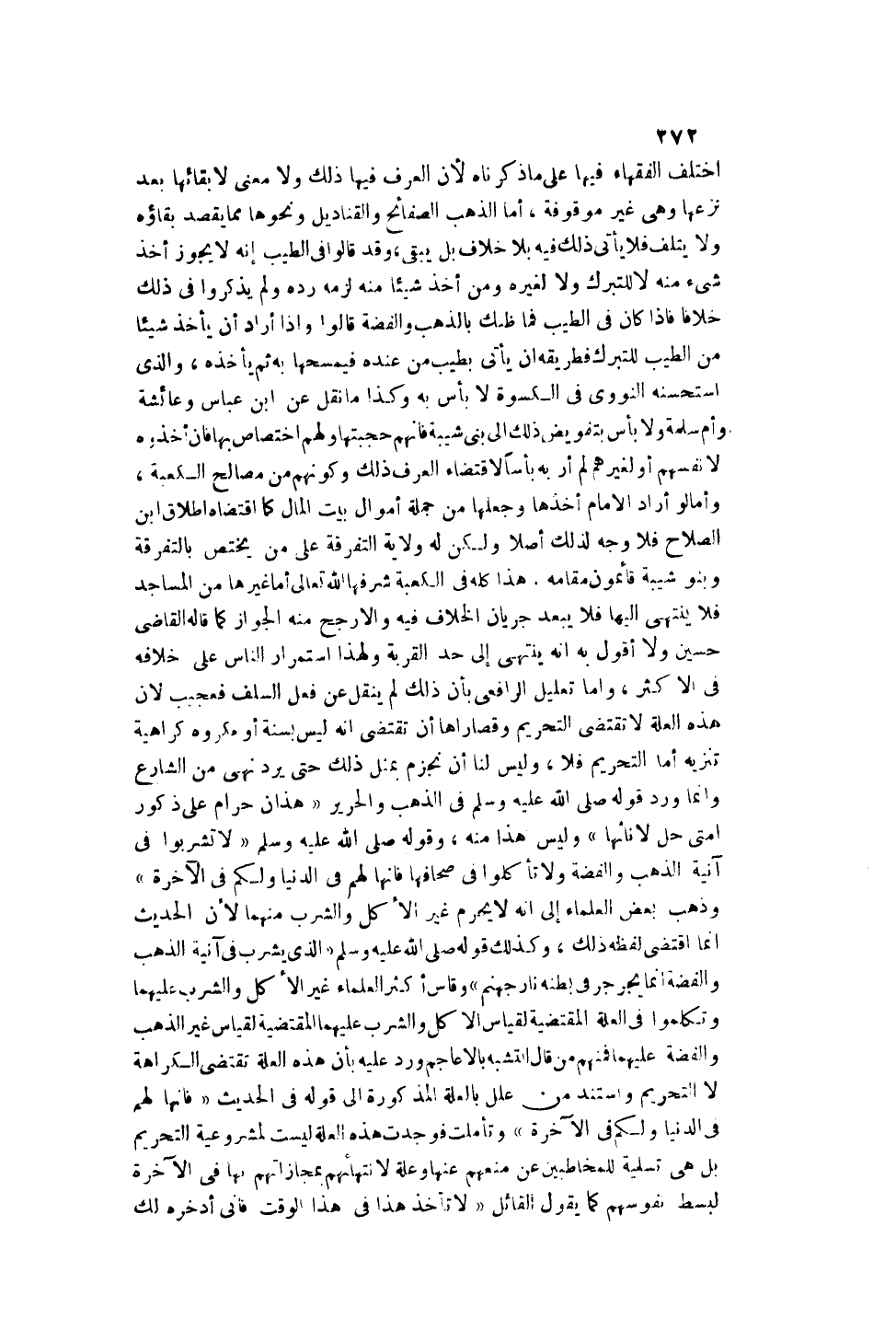 وَأَمَّا تَعْلِيلُ الرَّافِعِيِّ بِأَنَّ ذَلِكَ لَمْ يُنْقَلْ عَنْ فِعْلِ السَّلَفِ فَعَجِيبٌ لِأَنَّ هَذِهِ الْعِلَّةَ لَا تَقْتَضِي التَّحْرِيمَ وَقُصَارَاهَا أَنْ تَقْتَضِيَ أَنَّهُ لَيْسَ بِسُنَّةٍ أَوْ مَكْرُوهٍ كَرَاهِيَةَ تَنْزِيهٍ أَمَّا التَّحْرِيمُ فَلَا، وَلَيْسَ لَنَا أَنْ نَجْزِمَ بِمِثْلِ ذَلِكَ حَتَّى يَرِدَ نَهْيٌ مِنْ الشَّارِعِ وَإِنَّمَا وَرَدَ قَوْلُهُ - صَلَّى اللَّهُ عَلَيْهِ وَسَلَّمَ - فِي الذَّهَبِ وَالْحَرِيرِ «هَذَانِ حَرَامٌ عَلَى ذُكُورِ أُمَّتِي حِلٌّ لِإِنَاثِهَا» وَلَيْسَ هَذَا مِنْهُ، وَقَوْلُهُ - صَلَّى اللَّهُ عَلَيْهِ وَسَلَّمَ - «لَا تَشْرَبُوا فِي آنِيَةِ الذَّهَبِ وَالْفِضَّةِ وَلَا تَأْكُلُوا فِي صِحَافِهَا فَإِنَّهَا لَهُمْ فِي الدُّنْيَا وَلَكُمْ فِي الْآخِرَةِ» وَذَهَبَ بَعْضُ الْعُلَمَاءِ إلَى أَنَّهُ لَا يَحْرُمُ غَيْرُ الْأَكْلِ وَالشُّرْبِ مِنْهُمَا لِأَنَّ الْحَدِيثَ إنَّمَا اقْتَضَى لَفْظُهُ ذَلِكَ.