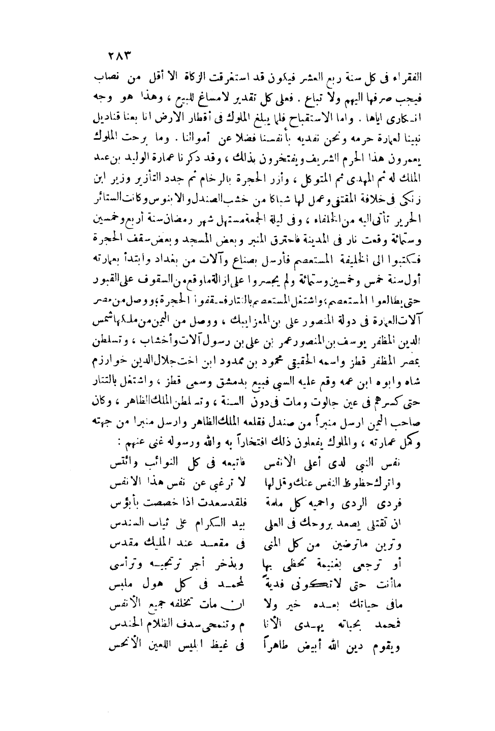 وَأَمَّا الِاسْتِقْبَاحُ فَلِمَا يَبْلُغُ الْمُلُوكَ فِي أَقْطَارِ الْأَرْضِ أَنَّا بِعْنَا قَنَادِيلَ نَبِيِّنَا لِعِمَارَةِ حَرَمِهِ وَنَحْنُ نَفْدِيهِ بِأَنْفُسِنَا فَضْلًا عَنْ أَمْوَالِنَا. وَمَا بَرِحَتْ الْمُلُوكُ يَعْمُرُونَ هَذَا الْحَرَمَ الشَّرِيفَ وَيَفْتَخِرُونَ بِذَلِكَ، وَقَدْ ذَكَرْنَا عِمَارَةَ الْوَلِيدِ بْنِ عَبْدِ الْمَلِكِ لَهُ ثُمَّ الْمَهْدِيِّ ثُمَّ الْمُتَوَكِّلِ، وَأَزَّرَ الْحُجْرَةَ بِالرُّخَامِ ثُمَّ جَدَّدَ التَّأْزِيرَ وَزِيرُ ابْنِ زَنْكِيٍّ فِي خِلَافَةِ الْمُقْتَفِي وَعَمِلَ لَهَا شُبَّاكًا مِنْ خَشَبِ الصَّنْدَلِ وَالْأَبَنُوسِ وَكَانَتْ السَّتَائِرُ الْحَرِيرُ تَأْتِي إلَيْهِ مِنْ الْخُلَفَاءِ، وَفِي لَيْلَةِ الْجُمُعَةِ مُسْتَهَلَّ شَهْرِ رَمَضَانَ سَنَةَ أَرْبَعٍ وَخَمْسِينَ وَسِتِّمِائَةٍ وَقَعَتْ نَارٌ فِي الْمَدِينَةِ فَاحْتَرَقَ الْمِنْبَرُ وَبَعْضُ الْمَسْجِدِ وَبَعْضُ سَقْفِ الْحُجْرَةِ فَكَتَبُوا إلَى الْخَلِيفَةِ الْمُسْتَعْصِمِ فَأَرْسَلَ بِصُنَّاعٍ وَآلَاتٍ مِنْ بَغْدَادَ وَابْتَدَأَ بِعِمَارَتِهِ أَوَّلَ سَنَةِ خَمْسٍ وَخَمْسِينَ وَسِتِّمِائَةٍ وَلَمْ يَجْسُرُوا عَلَى إزَالَةِ مَا وَقَعَ مِنْ السُّقُوفِ عَلَى الْقُبُورِ حَتَّى يُطَالِعُوا الْمُسْتَعْصِمَ.
