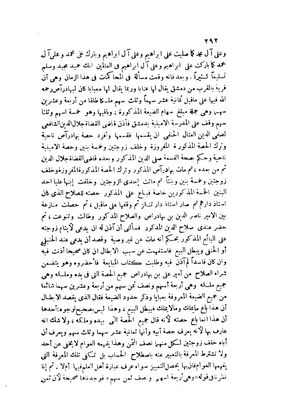 وَعَلَى آلِ مُحَمَّدٍ كَمَا صَلَّيْت عَلَى إبْرَاهِيمَ وَعَلَى آلِ إبْرَاهِيمَ وَبَارِكْ عَلَى مُحَمَّدٍ وَعَلَى آلِ مُحَمَّدٍ كَمَا بَارَكْت عَلَى إبْرَاهِيمَ وَعَلَى آلِ إبْرَاهِيمَ فِي الْعَالَمِينَ إنَّك حَمِيدٌ مَجِيدٌ وَسَلِّمْ تَسْلِيمًا كَثِيرًا. وَبَعْدُ فَإِنَّهُ وَقَعَتْ مَسْأَلَةٌ فِي الْمُحَاكَمَاتِ فِي هَذَا الزَّمَانِ، وَهِيَ أَنَّ قَرْيَةً بِالْقُرْبِ مِنْ دِمَشْقَ يُقَالُ لَهَا عُنَابَا وَرُبَّمَا يُقَالُ لَهَا مُعْبَابَا كَانَ لِبَهَادِرْآصْ - رَحِمَهُ اللَّهُ - فِيهَا عَلَى مَا قِيلَ ثَمَانِيَةَ عَشَرَ سَهْمًا وَثُلُثُ سَهْمٍ مِلْكًا طَلْقًا مِنْ أَرْبَعَةٍ وَعِشْرِينَ سَهْمًا، وَهِيَ جُمْلَةُ مَبْلَغِ سِهَامِ الضَّيْعَةِ الْمَذْكُورَةِ، وَبَاقِيهَا، وَهُوَ خَمْسَةُ أَسْهُمٍ وَثُلُثَا سَهْمٍ وَقْفٌ عَلَى الْمَدْرَسَةِ الْأَمِينِيَّةِ بِدِمَشْقَ فَأَذِنَ قَاضِي الْقُضَاةِ جَلَالُ الدِّينِ الشَّافِعِيُّ لِصَفِيِّ الدِّينِ الْعَتَّالِ الْحَنَفِيِّ أَنْ يُقَسِّمَهَا فَقَسَّمَهَا وَأَفْرَدَ حِصَّةَ بَهَادِرْآصْ نَاحِيَةً وَتَرَكَ الْحِصَّةَ الْمَذْكُورَةَ الْمَفْرُوزَةَ وَخَلَّفَ زَوْجَتَيْنِ وَخَمْسَةَ بَنِينَ وَحِصَّةَ الْأَمِينِيَّةِ نَاحِيَةً.