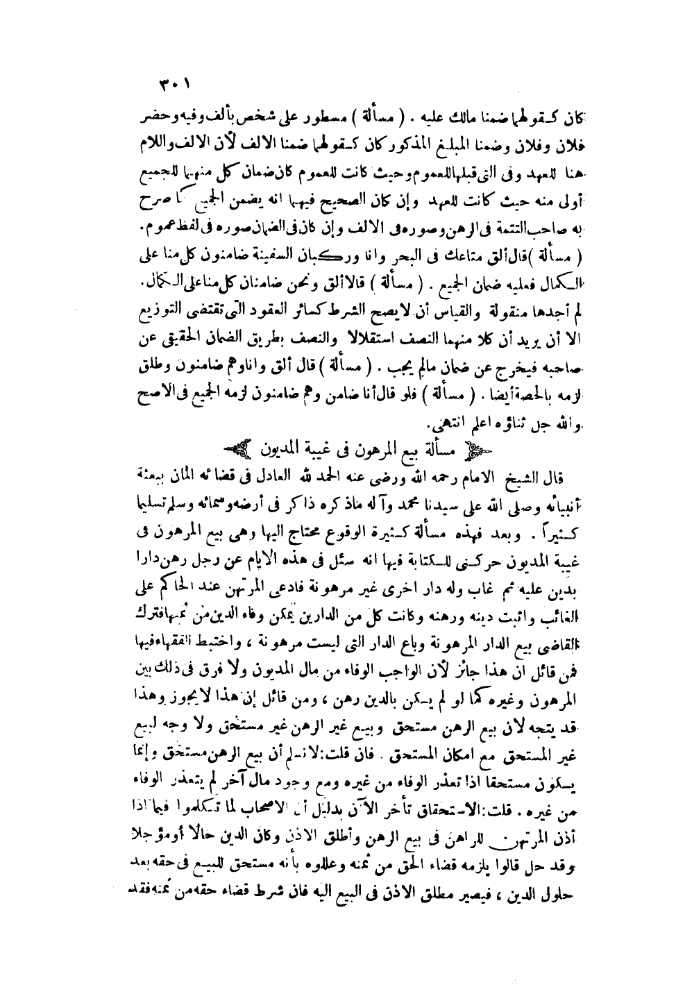 (مَسْأَلَةٌ بَيْعُ الْمَرْهُونِ فِي غَيْبَةِ الْمَدْيُونِ) قَالَ الشَّيْخُ الْإِمَامُ رَحِمَهُ اللَّهُ وَرَضِيَ عَنْهُ: الْحَمْدُ لِلَّهِ الْعَادِلِ فِي قَضَائِهِ الْمَانِّ بِبَعْثَةِ أَنْبِيَائِهِ وَصَلَّى اللَّهُ عَلَى سَيِّدِنَا مُحَمَّدٍ وَآلِهِ مَا ذَكَرَهُ ذَاكِرٌ فِي أَرْضِهِ وَسَمَائِهِ وَسَلِّمْ تَسْلِيمًا كَثِيرًا. وَبَعْدُ فَهَذِهِ مَسْأَلَةٌ كَثِيرَةُ الْوُقُوعِ مُحْتَاجٌ إلَيْهَا، وَهِيَ بَيْعُ الْمَرْهُونِ فِي غَيْبَةِ الْمَدْيُونِ حَرَّكَنِي لِلْكِتَابَةِ فِيهَا أَنَّهُ سُئِلَ فِي هَذِهِ الْأَيَّامِ عَنْ رَجُلٍ رَهَنَ دَارًا بِدَيْنٍ عَلَيْهِ ثُمَّ غَابَ وَلَهُ دَارٌ أُخْرَى غَيْرُ مَرْهُونَةٍ فَادَّعَى الْمُرْتَهِنُ عِنْدَ الْحَاكِمِ عَلَى الْغَائِبِ وَأَثْبَتَ دَيْنَهُ وَرَهَنَهُ وَكَانَتْ كُلٌّ مِنْ الدَّارَيْنِ يُمْكِنُ وَفَاءُ الدَّيْنِ مِنْ ثَمَنِهَا، فَتَرَكَ الْقَاضِي بَيْعَ الدَّارِ الْمَرْهُونَةِ، وَبَاعَ الدَّارَ الَّتِي لَيْسَتْ مَرْهُونَةً، وَاخْتَبَطَ الْفُقَهَاءُ فِيهَا فَمِنْ قَائِلٍ: إنَّ هَذَا جَائِزٌ؛ لِأَنَّ الْوَاجِبَ الْوَفَاءُ مِنْ مَالِ الْمَدْيُونِ وَلَا فَرْقَ فِي ذَلِكَ بَيْنَ الْمَرْهُونِ وَغَيْرِهِ كَمَا لَوْ لَمْ يَكُنْ بِالدَّيْنِ رَهْنٌ، وَمِنْ قَائِلٍ: إنَّ هَذَا لَا يَجُوزُ، وَهَذَا قَدْ يُتَّجَهُ؛ لِأَنَّ بَيْعَ الرَّهْنِ مُسْتَحَقٌّ وَبَيْعَ غَيْرِ الرَّهْنِ غَيْرُ مُسْتَحَقٍّ، وَلَا وَجْهَ لِبَيْعِ غَيْرِ الْمُسْتَحَقِّ مَعَ إمْكَانِ الْمُسْتَحَقِّ.