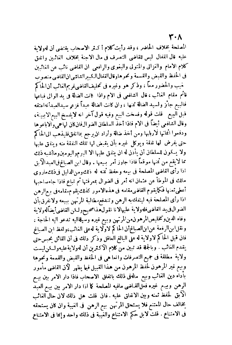 وَقَالَ ابْنُ الصَّبَّاغِ فِي الْعَبْدِ الْآبِقِ إذَا رَأَى الْقَاضِي الْمَصْلَحَةَ فِي بَيْعِهِ وَحِفْظِ ثَمَنِهِ لَهُ ذَلِكَ، وَمِنْ الدَّلِيلِ فِي ذَلِكَ مَا رَوَى مَالِكٌ فِي الْمُوَطَّإِ عَنْ عُثْمَانَ أَنَّهُ أَمَرَ فِي الضَّوَالِّ بِمَعْرِفَتِهَا ثُمَّ تُبَاعُ، فَإِذَا جَاءَ صَاحِبُهَا أُعْطِيَ ثَمَنُهَا، فَكَمَا يَقُومُ الْقَاضِي مَقَامَهُ فِي هَذِهِ الْأُمُورِ، كَذَلِكَ يَقُومُ مَقَامَهُ فِي بَيْعِ الرَّهْنِ إذَا رَأَى الْمَصْلَحَةَ فِيهِ لِيَنْفَكَّ بِهِ الرَّهْنُ وَتَنْدَفِعَ مُطَالَبَةُ الْمُرْتَهِنِ بِبَيْعِهِ، وَلَا نُفَرِّقُ بِأَنَّ الضَّوَالَّ فِي يَدِ الْقَاضِي فَلَهُ وِلَايَةٌ عَلَيْهَا؛ لِأَنَّا نَقُولُ: هَذَا صَحِيحٌ، وَلَكِنَّ الْقَاضِيَ أَيْضًا لَهُ وِلَايَةُ وَفَاءِ الدَّيْنِ وَتَخْلِيصُ الْمَرْهُونِ مِنْ الْمُرْتَهِنِ، وَبَيْعُ غَيْرِهِ وَسِيلَةٌ إلَيْهِ تَدْعُو إلَيْهِ الْحَاجَةُ، وَنَقَلَ ابْنُ الرِّفْعَةِ عَنْ ابْنِ الصَّبَّاغِ أَنَّ الْحَاكِمَ لَا وِلَايَةَ لَهُ عَلَى الْغَائِبِ، وَلَفْظُ ابْنِ الصَّبَّاغِ فَإِنْ قِيلَ: الْحَاكِمُ لَا وِلَايَةَ لَهُ عَلَى الْبَالِغِ الْعَاقِلِ، وَذَكَرَ ذَلِكَ فِي أَنَّ الْقَائِلَ يُحْبَسُ حَتَّى يَقْدَمَ الْغَائِبُ.